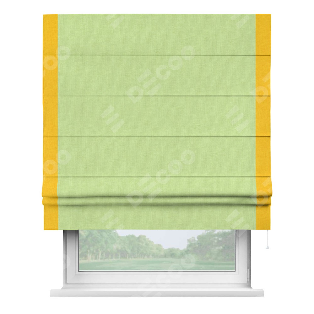 Римская штора производителя «Cortin», используется для проёма, пошита из ткани канвас липовый, артикул ткани v-207. Отделка шторы кантом «Стрим Дуо» (желтый v-344), ткань для канта используется из канваса разной расцветки на выбор. Имеет универсальный механизм и подходит для монтажа: на потолок, на стену и в нишу.