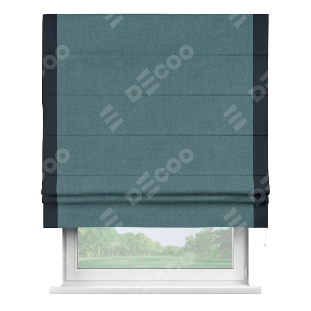 Римская штора производителя «Cortin», используется для проёма, пошита из ткани канвас ментоловый, артикул ткани v-114. Отделка шторы кантом «Стрим Дуо» (тёмно-синий v-206), ткань для канта используется из канваса разной расцветки на выбор. Имеет универсальный механизм и подходит для монтажа: на потолок, на стену и в нишу.