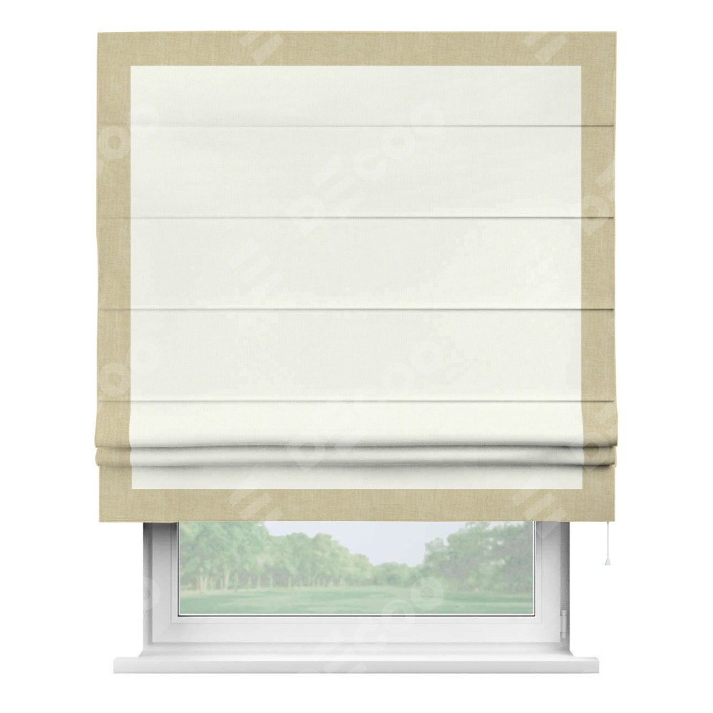 Римская штора производителя «Cortin», используется для проёма, пошита из ткани канвас молочный, артикул ткани v-93. Отделка шторы кантом «Чесс» (тёмно-бежевый v-196), ткань для канта используется из канваса разной расцветки на выбор. Имеет универсальный механизм и подходит для монтажа: на потолок, на стену и в нишу.