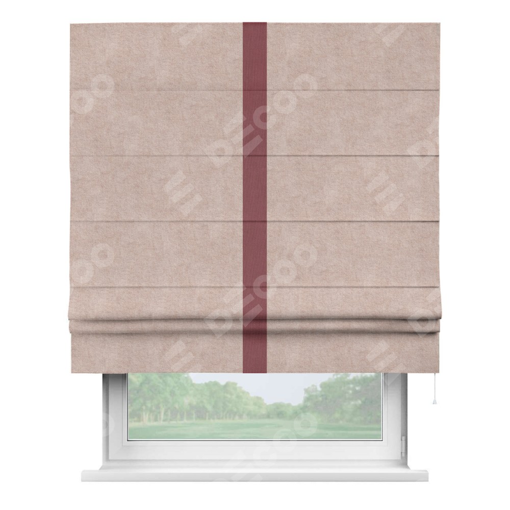 Римская штора производителя «Cortin», используется для проёма, пошита из ткани канвас пудровый, артикул ткани v-35. Отделка шторы кантом «Хайвей» (ягодный v-28), ткань для канта используется из канваса разной расцветки на выбор. Имеет универсальный механизм и подходит для монтажа: на потолок, на стену и в нишу.