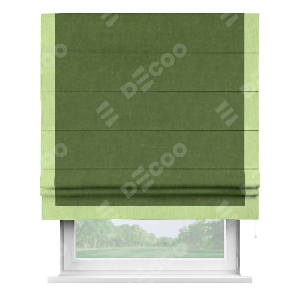 Римская штора производителя «Cortin», используется для проёма, пошита из ткани канвас трава, артикул ткани v-473. Отделка шторы кантом «Виктория» (липовый v-207), ткань для канта используется из канваса разной расцветки на выбор. Имеет универсальный механизм и подходит для монтажа: на потолок, на стену и в нишу.