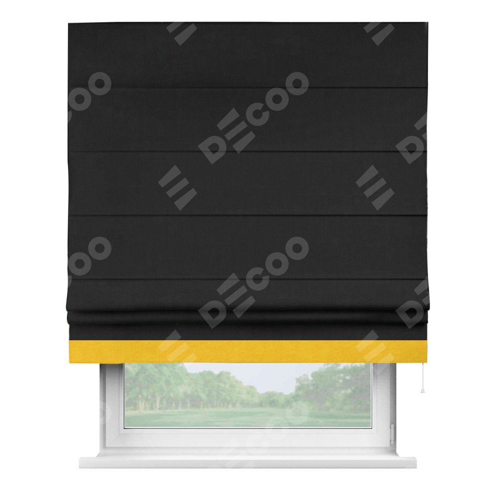 Римская штора производителя «Cortin», используется для проёма, пошита из ткани канвас черный, артикул ткани v-194. Отделка шторы кантом «Джестер» (желтый v-344), ткань для канта используется из канваса разной расцветки на выбор. Имеет универсальный механизм и подходит для монтажа: на потолок, на стену и в нишу.