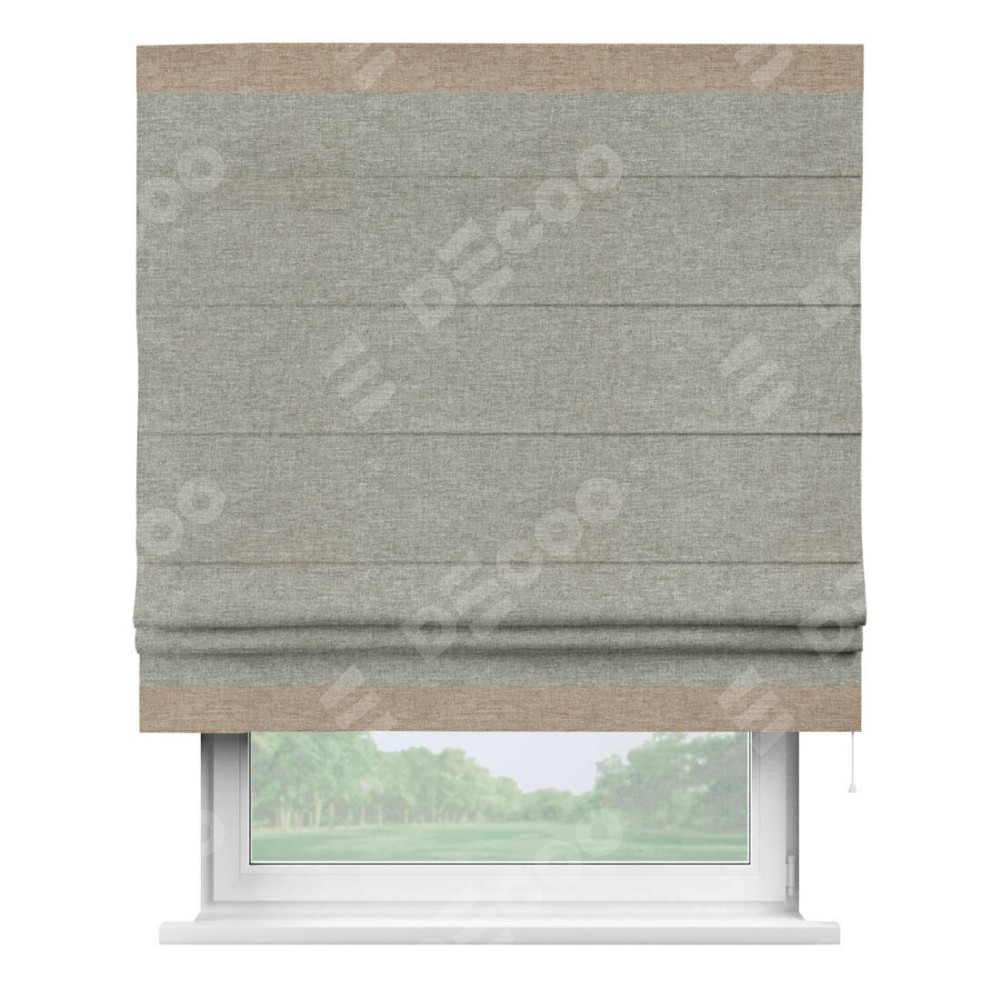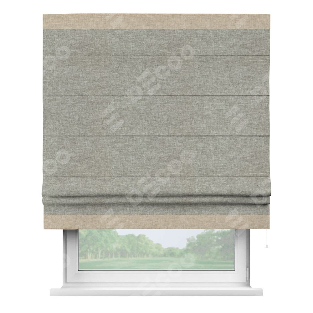 Римская штора производителя «Cortin», используется для проёма, пошита из ткани лён кашемир серый, артикул 17208. Отделка шторы кантом «Горизонт», ткань для канта используется из льна разной расцветки на выбор. Имеет универсальный механизм и подходит для монтажа: на потолок, на стену и в нишу.