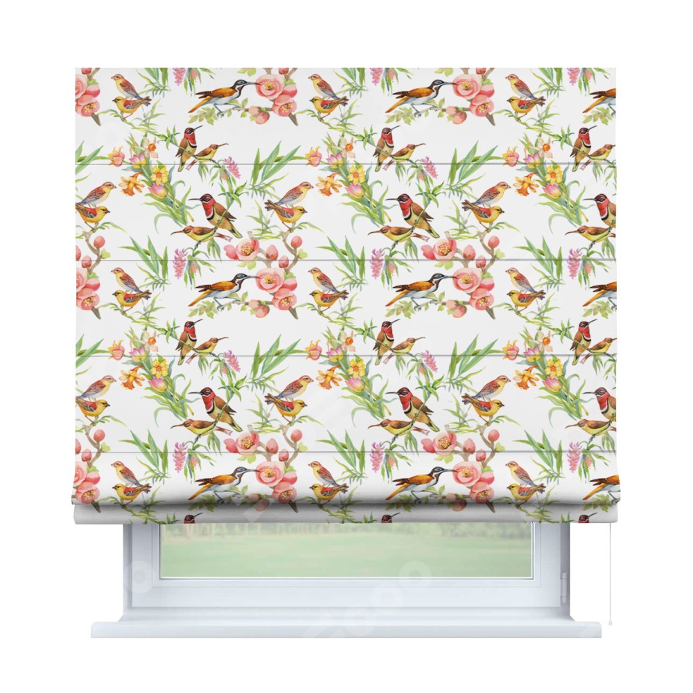 Классическая римская штора производителя «Cortin», пошита из ткани блэкаут с нанесением сублимационной печати «Певчие птички». Имеет универсальный механизм и подходит для монтажа: на потолок, на стену и в нишу.