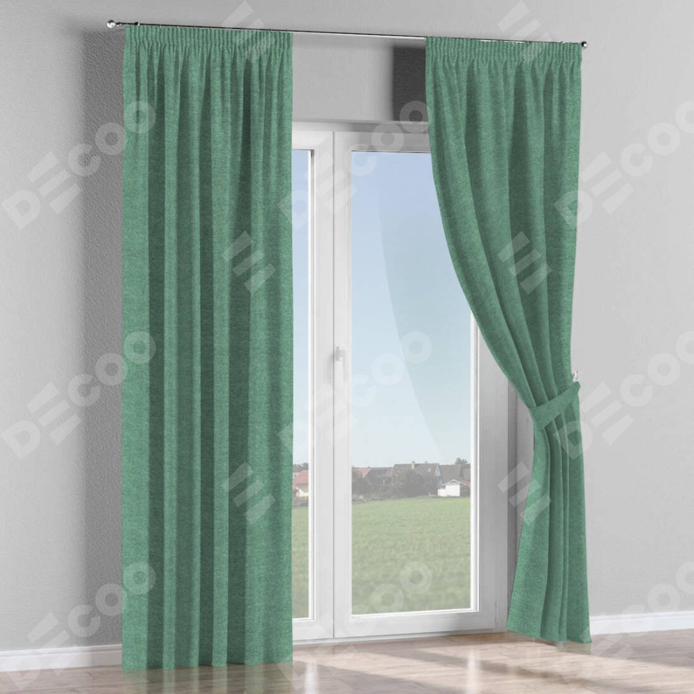 Комплект прямых штор, от производителя «Cortin», пошиты из ткани твид блэкаут бирюзовый, артикул ткани 90934. С изнаночной стороны в верхней части штор пристрачивается шторная лента с декоративными складками «Карандаш». Для создания элегантных складок прямые шторы шьются по стандарту с коэффициентом 1:2 (на 100 см. ширины проёма 200 см. ширины ткани).
