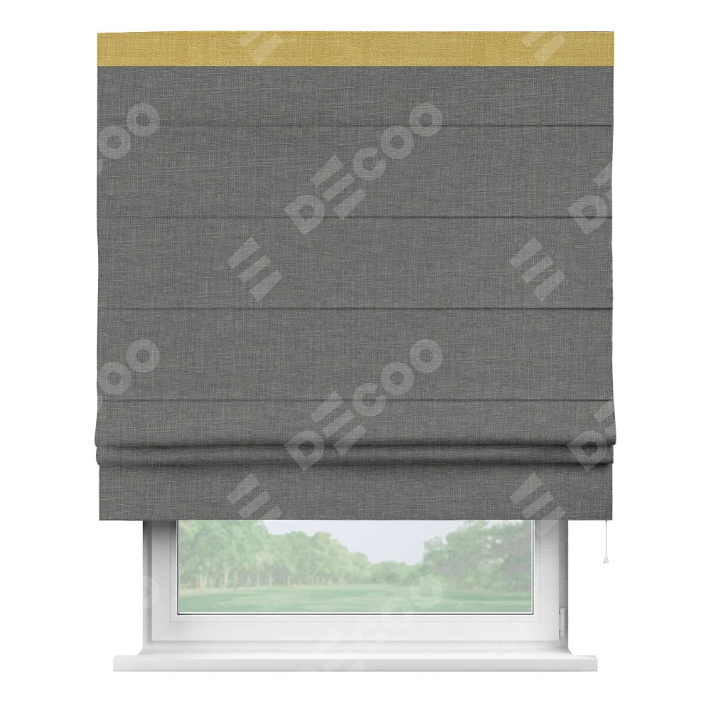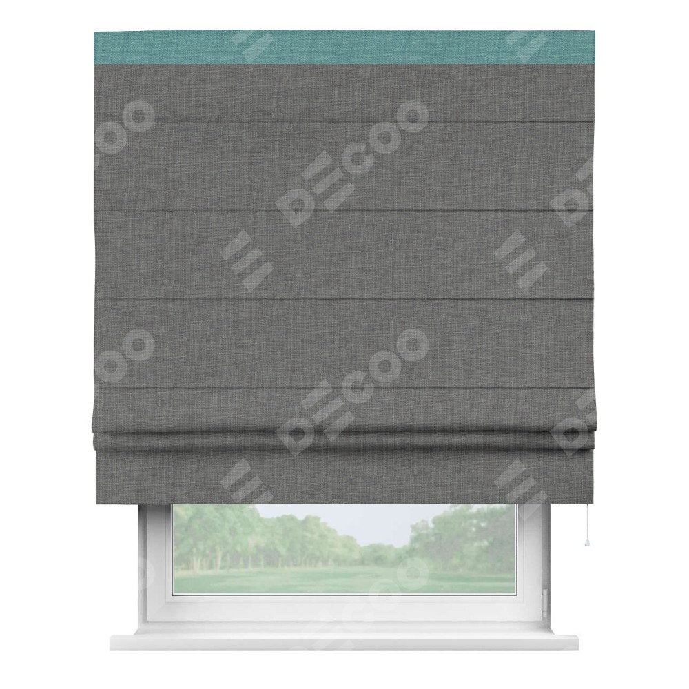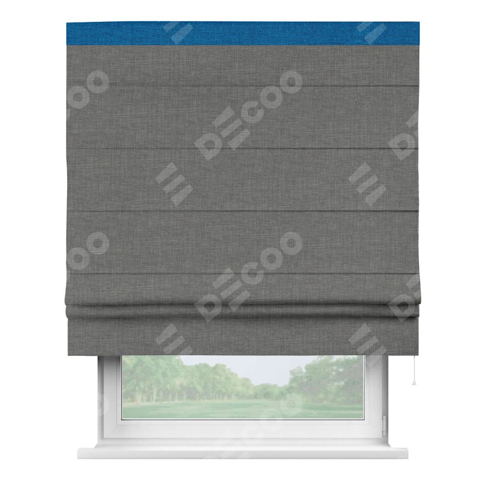 Римская штора производителя «Cortin», используется для проёма, пошита из ткани лён тёмно-серый, артикул 7441. Отделка шторы кантом «Кинг», ткань для канта используется из льна разной расцветки на выбор. Имеет универсальный механизм и подходит для монтажа: на потолок, на стену и в нишу.