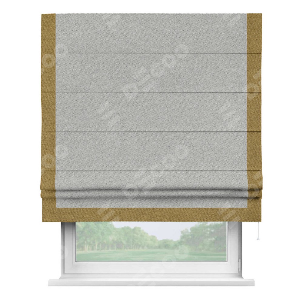 Римская штора производителя «Cortin», используется для проёма, пошита из ткани твид блэкаут светло-серый, артикул 90936. Отделка шторы кантом «Виктория», ткань для канта используется из твида разной расцветки на выбор. Имеет универсальный механизм и подходит для монтажа: на потолок, на стену и в нишу.