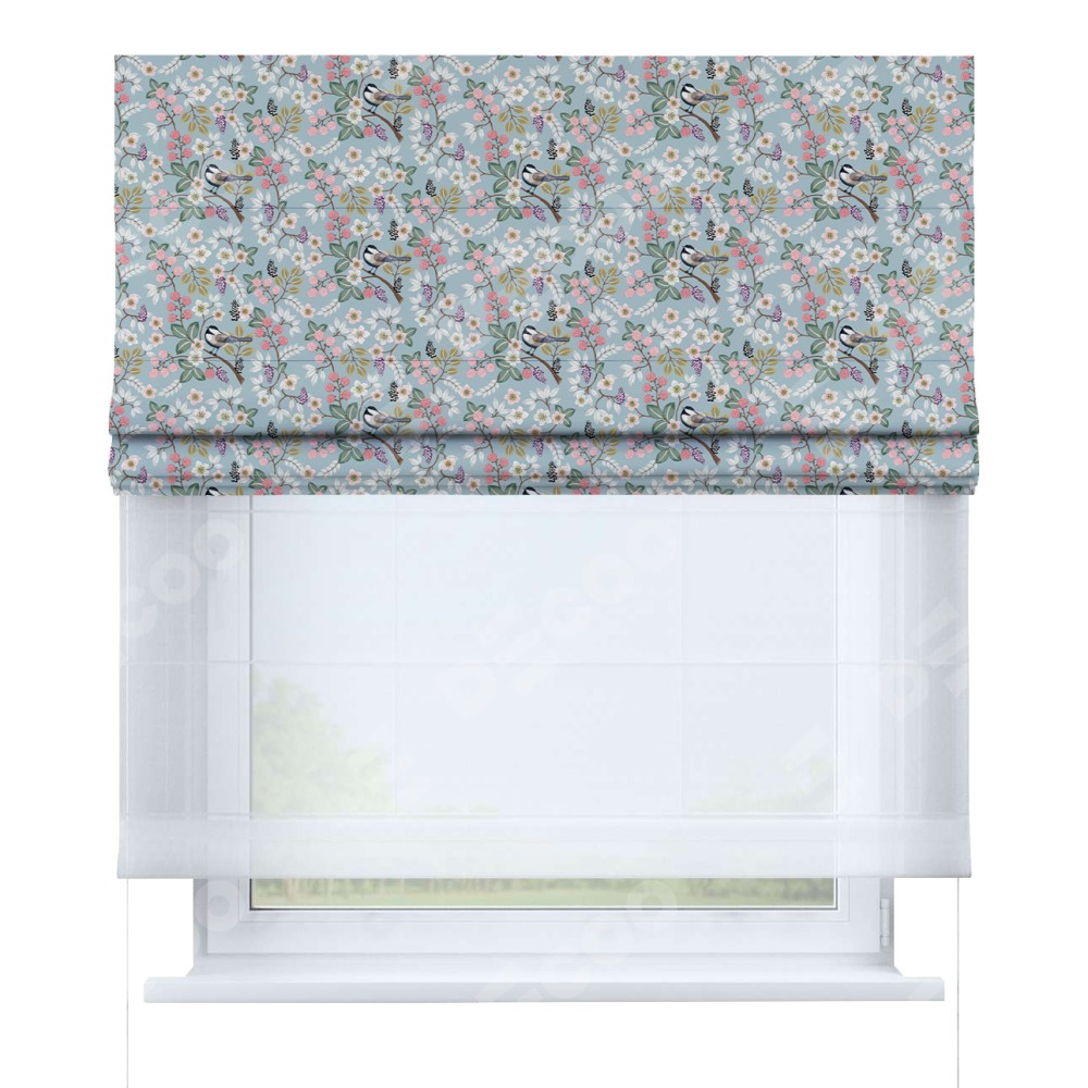 Двойная римская штора «День-ночь» от производителя Cortin предназначена для использования в проёмах. Эта штора уникальна тем, что состоит из двух полотен. На лицевой стороне находится блэкаут с нанесением сублимационной печати «Ежевичное утро», обеспечивающий эффективное затемнение. В комплект также входит вторая ткань — легкий белый тюль (артикул: V-01), который добавляет изящества и легкости оформлению окна. Кроме того, доступны и другие разновидности ткани тюль, выбор которых доступен по  ссылке .
