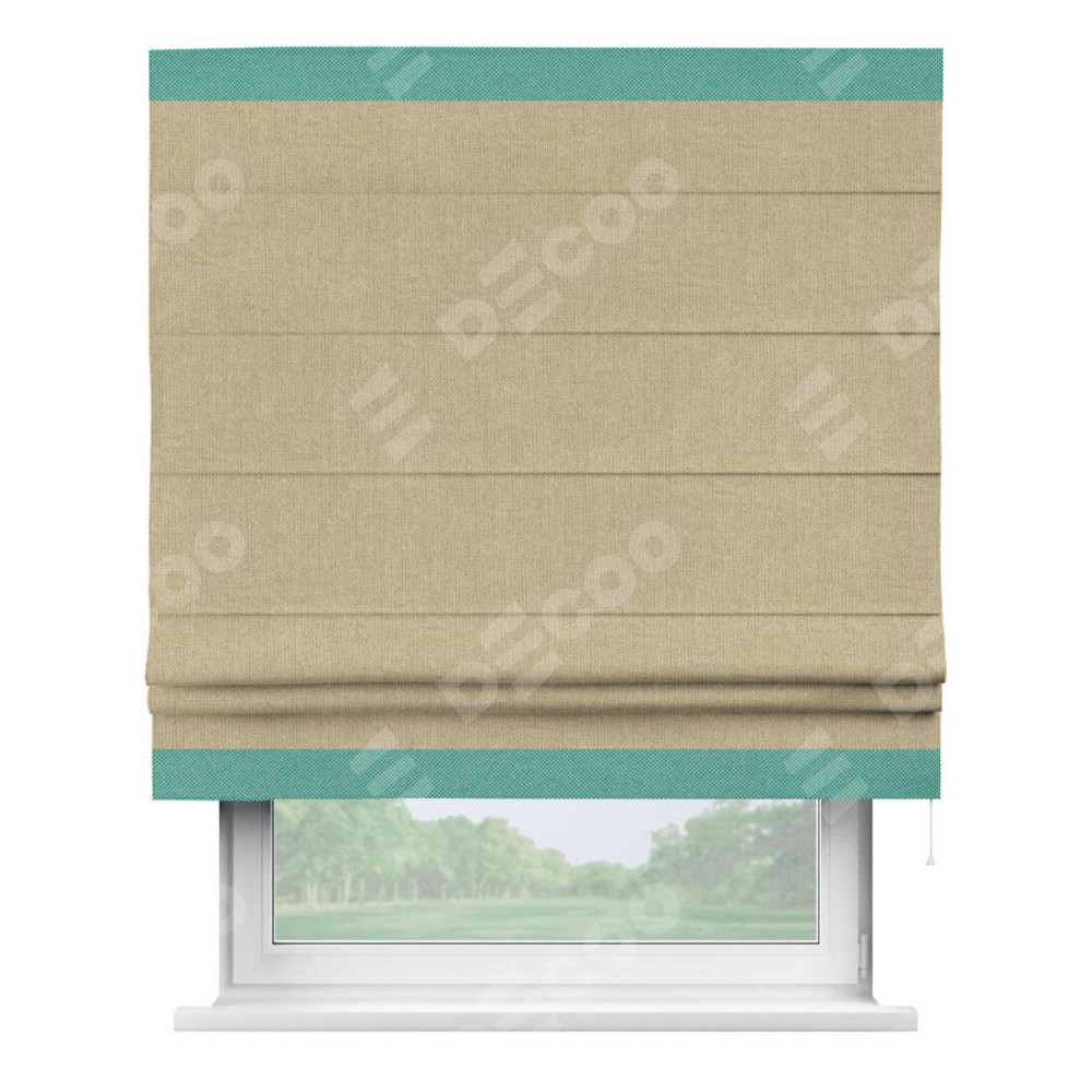 Римская штора пошита из ткани лён димаут песочный, артикул: 16256, с отделкой кантом «Горизонт» предлагает уникальное дизайнерское решение, при котором кант располагается только вверху и снизу шторы. Такое решение делает акцент на горизонтальных линиях, визуально расширяя пространство и придавая окну более строгий и организованный вид. Отделка кантом в этих ключевых местах не только украшает штору, но и способствует её долговечности, защищая наиболее уязвимые к износу края.