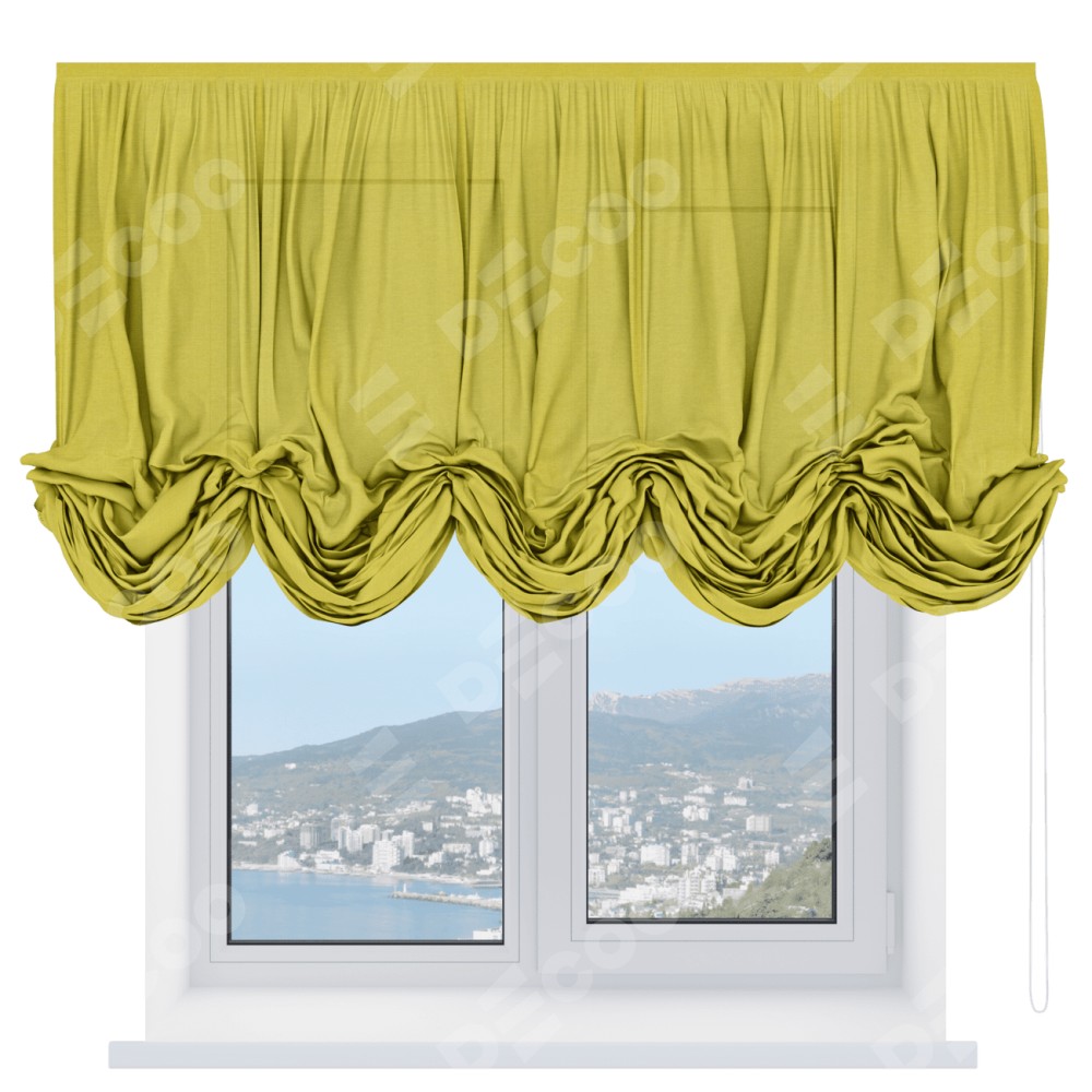Австрийская штора производителя «Cortin», используется для проёма, пошита из ткани лён салатовый, артикул ткани 53437. Имеет универсальный механизм и подходит для монтажа: на потолок и на стену.