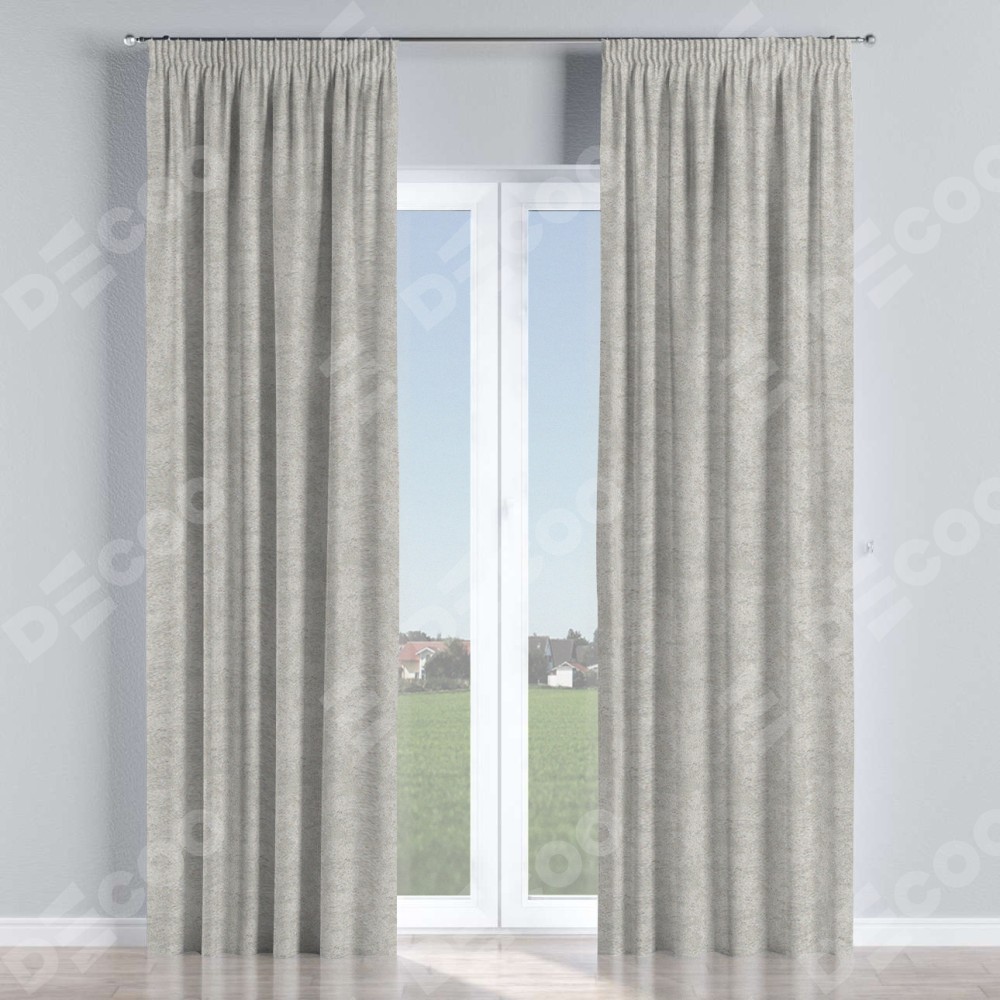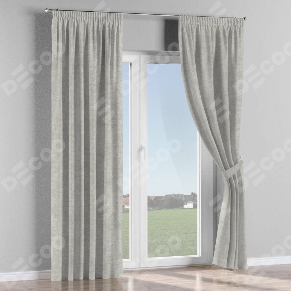 Комплект прямых штор, от производителя «Cortin», пошиты из ткани софт мрамор светло-серый, артикул ткани 93582. С изнаночной стороны в верхней части штор пристрачивается шторная лента с декоративными складками «Карандаш». Для создания элегантных складок прямые шторы шьются по стандарту с коэффициентом 1:2 (на 100 см. ширины проёма 200 см. ширины ткани).