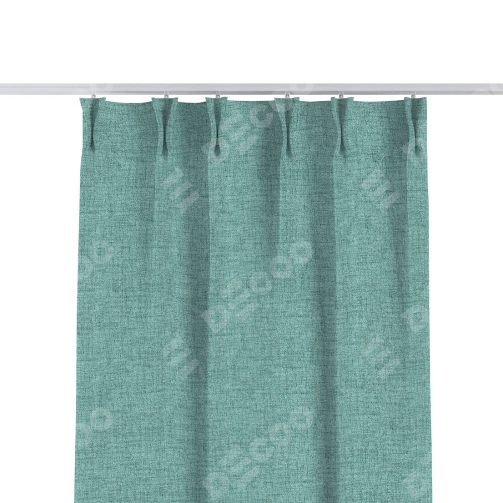 Комплект прямых штор, от производителя «Cortin», пошиты из ткани рогожка димаут аквамариновый крайола, артикул ткани 91023. С изнаночной стороны в верхней части штор пристрачивается шторная лента с декоративными складками «Кустик». Для создания элегантных складок прямые шторы шьются по стандарту с коэффициентом 1:2 (на 100 см. ширины проёма 200 см. ширины ткани).