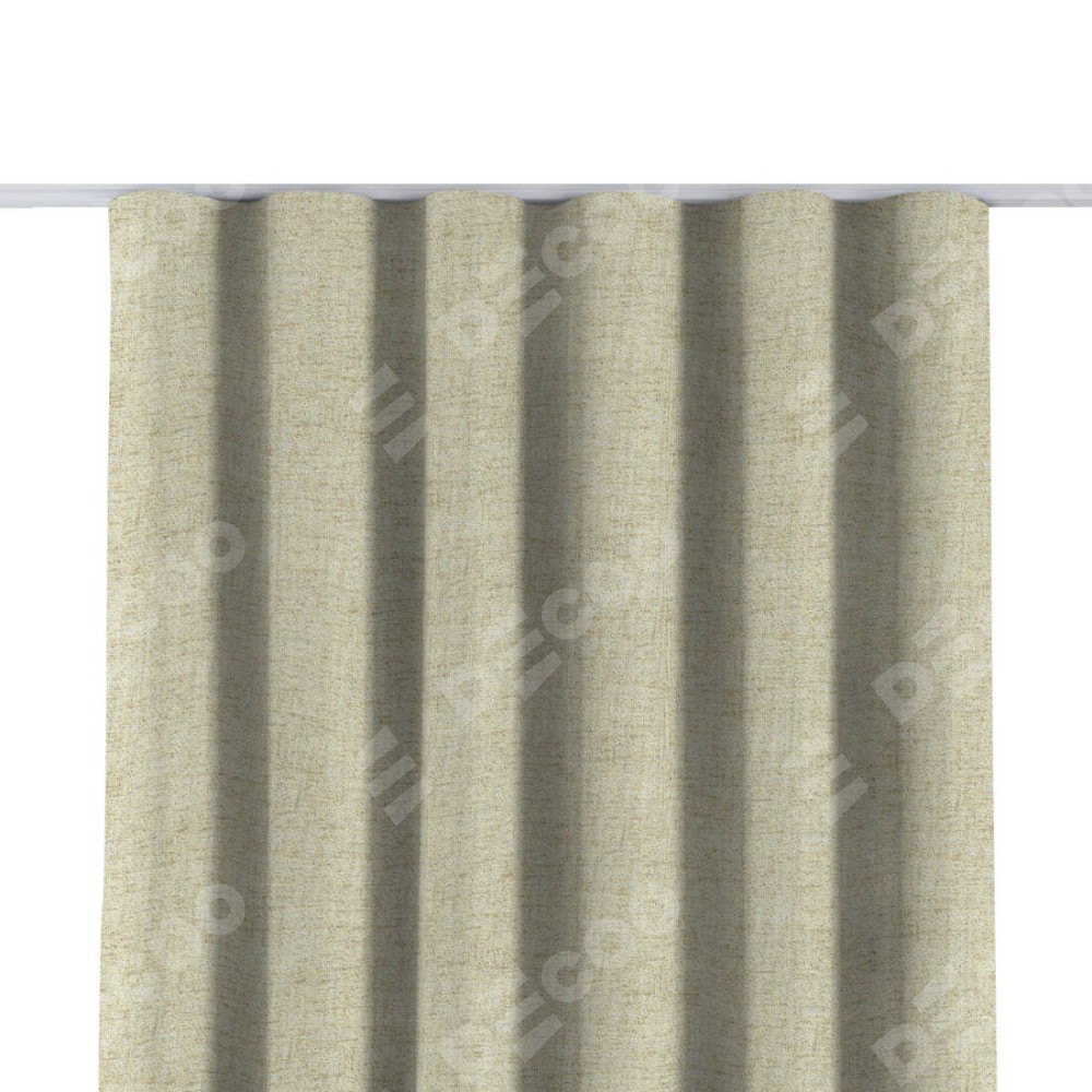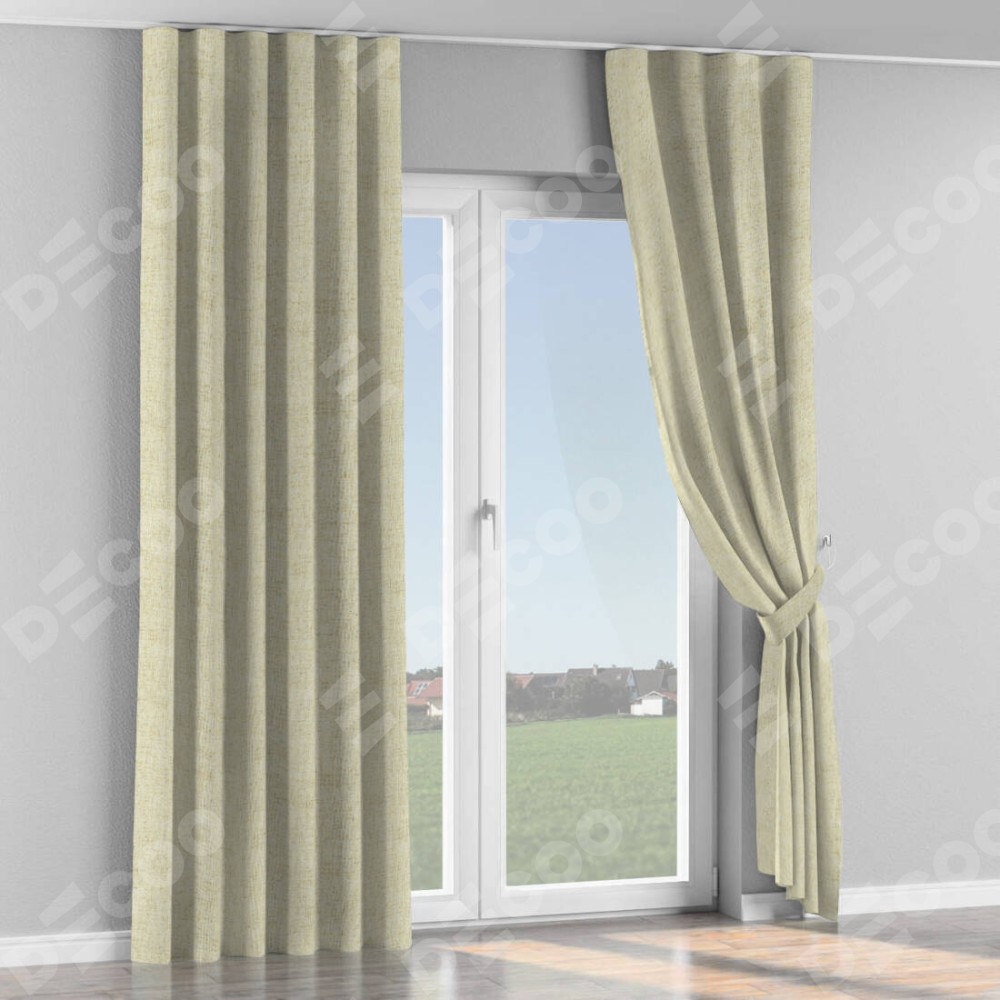 Комплект прямых штор, от производителя «Cortin», пошиты из ткани рогожка димаут золотой песок, артикул ткани 91015. С изнаночной стороны в верхней части штор пристрачивается шторная лента с декоративными складками «Волна». Для создания элегантных складок прямые шторы шьются по стандарту с коэффициентом 1:2 (на 100 см. ширины проёма 200 см. ширины ткани).