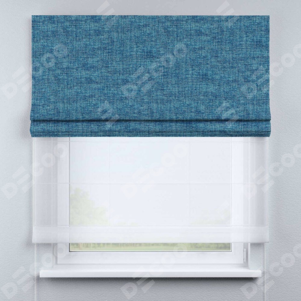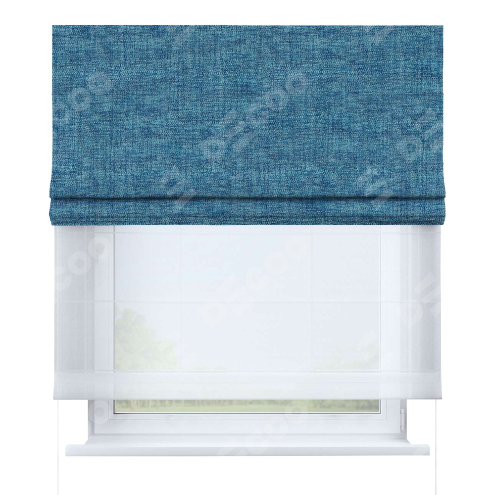 Двойная римская штора «День-ночь» от производителя Cortin предназначена для использования в проёмах. Эта штора уникальна тем, что состоит из двух полотен. На лицевой стороне находится рогожка димаут лазурно-синий (артикул: 91024), обеспечивающий эффективное затемнение. В комплект также входит вторая ткань — легкий белый тюль (артикул: V-01), который добавляет изящества и легкости оформлению окна. Кроме того, доступны и другие разновидности ткани тюль, выбор которых доступен по  ссылке .