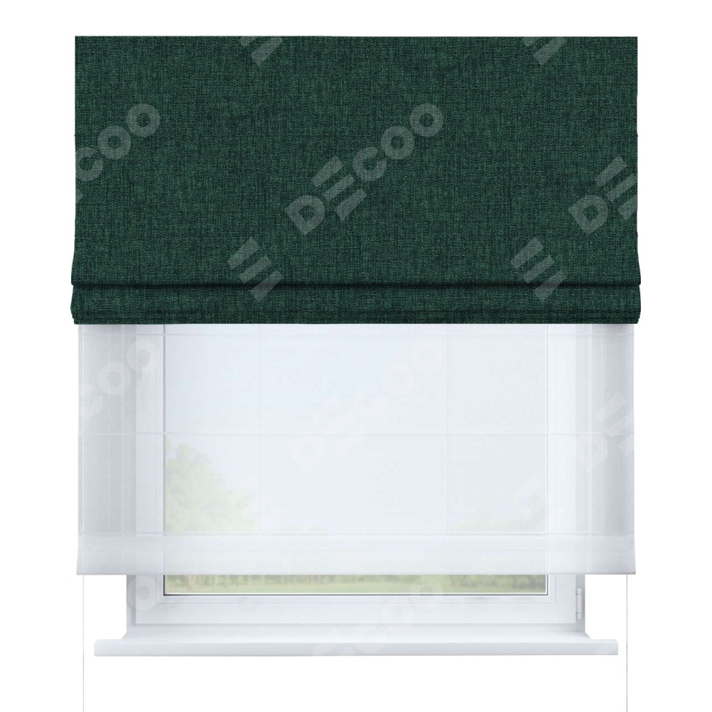 Двойная римская штора «День-ночь» от производителя Cortin предназначена для использования в проёмах. Эта штора уникальна тем, что состоит из двух полотен. На лицевой стороне находится рогожка димаут тёмно-зелёный (артикул: 91022), обеспечивающий эффективное затемнение. В комплект также входит вторая ткань — легкий белый тюль (артикул: V-01), который добавляет изящества и легкости оформлению окна. Кроме того, доступны и другие разновидности ткани тюль, выбор которых доступен по ссылке .