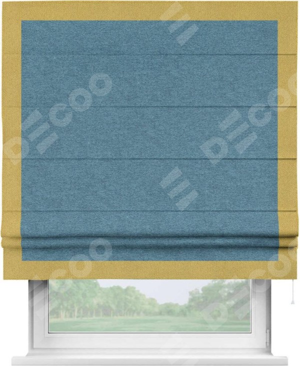 Римская штора пошита из ткани твид блэкаут светло-синий, артикул: 90935, с отделкой кантом «Чесс» отличается своей уникальной деталью — наличием канта не только по бокам и снизу, но и сверху по всем краям шторы. Это придает шторе особенно аккуратный и завершенный вид, делая акцент на границах и форме шторы. Отделка кантом по всему периметру шторы усиливает её декоративные качества и подчеркивает строгую геометрию, что может быть особенно актуально для современных и минималистичных интерьеров.