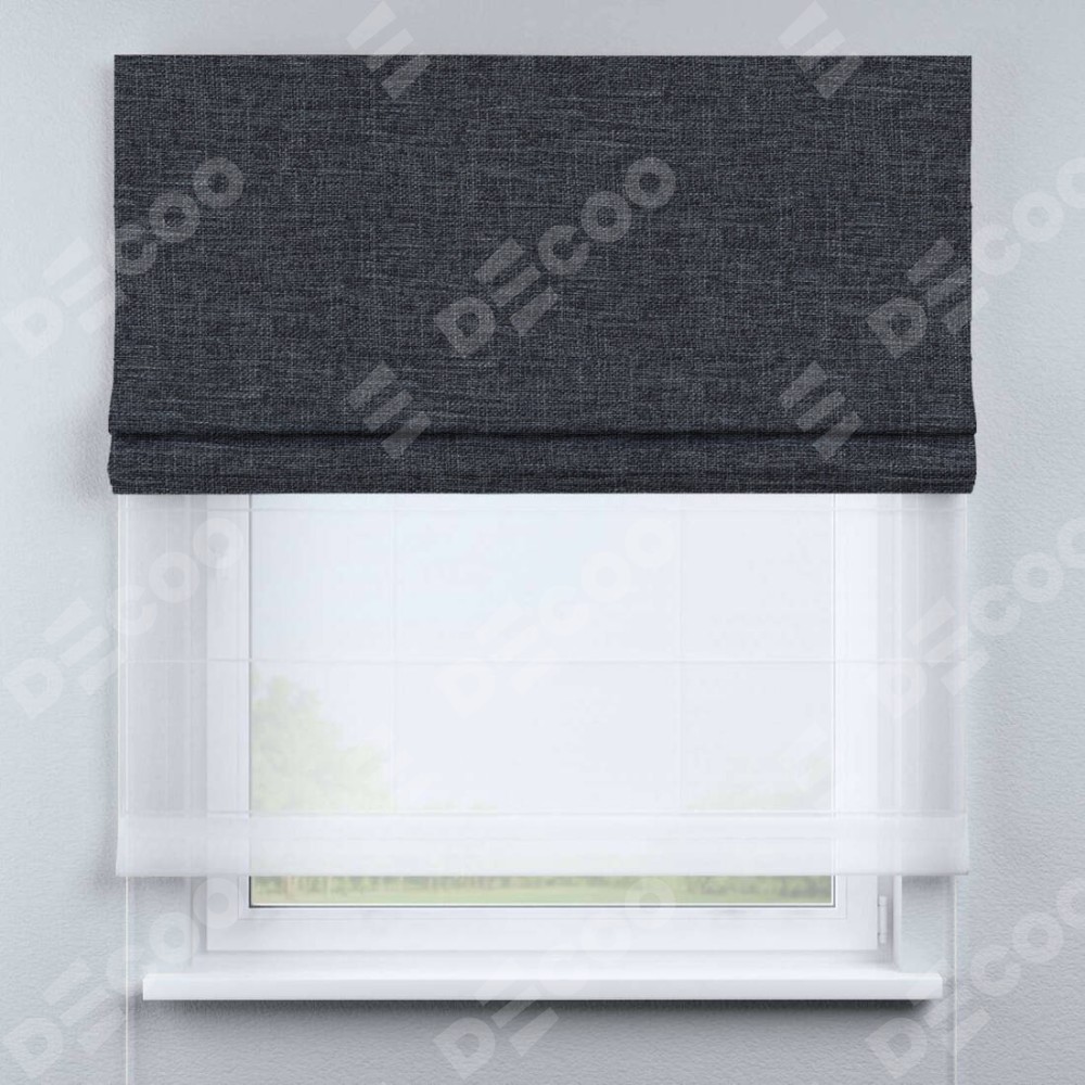 Двойная римская штора «День-ночь» от производителя Cortin предназначена для использования в проёмах. Эта штора уникальна тем, что состоит из двух полотен. На лицевой стороне находится рогожка димаут графит (артикул: 90950), обеспечивающий эффективное затемнение. В комплект также входит вторая ткань — легкий белый тюль (артикул: V-01), который добавляет изящества и легкости оформлению окна. Кроме того, доступны и другие разновидности ткани тюль, выбор которых доступен по  ссылке .