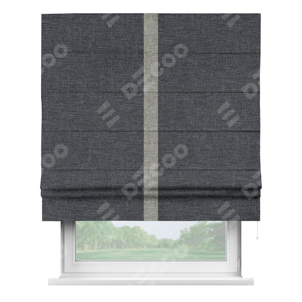 Римская штора пошита из ткани рогожка димаут графит, артикул: 90950, с отделкой кантом «Хайвэй» представляет собой уникальное и смелое дизайнерское решение, где кант расположен вертикально посередине шторы. Этот дизайн не только выделяет штору среди других вариантов оформления окон, но и создает интересный визуальный акцент, привлекая внимание к центру окна и разделяя штору на визуальные зоны. Такой нестандартный подход добавляет динамичности интерьеру и может быть использован для подчеркивания особенностей оформления помещения.