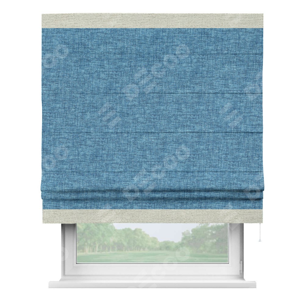 Римская штора пошита из ткани рогожка димаут джинс, артикул: 91026, с отделкой кантом «Горизонт» предлагает уникальное дизайнерское решение, при котором кант располагается только вверху и снизу шторы. Такое решение делает акцент на горизонтальных линиях, визуально расширяя пространство и придавая окну более строгий и организованный вид. Отделка кантом в этих ключевых местах не только украшает штору, но и способствует её долговечности, защищая наиболее уязвимые к износу края.