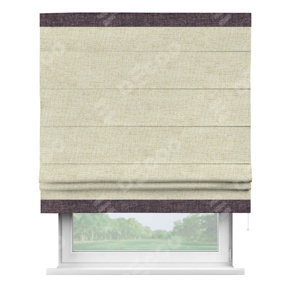 Римская штора пошита из ткани рогожка димаут золотой песок, артикул: 91015, с отделкой кантом «Горизонт» предлагает уникальное дизайнерское решение, при котором кант располагается только вверху и снизу шторы. Такое решение делает акцент на горизонтальных линиях, визуально расширяя пространство и придавая окну более строгий и организованный вид. Отделка кантом в этих ключевых местах не только украшает штору, но и способствует её долговечности, защищая наиболее уязвимые к износу края.