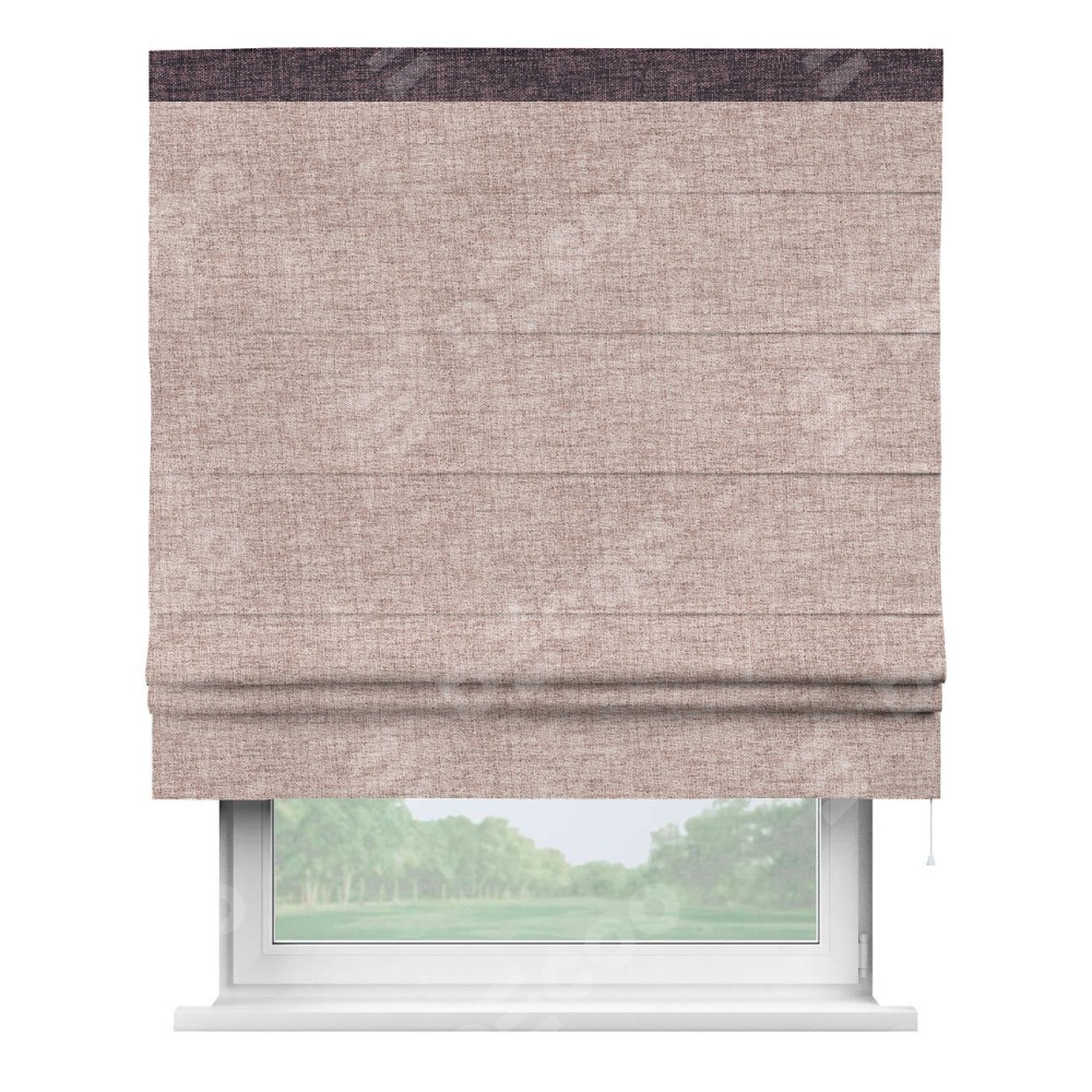 Римская штора пошита из ткани рогожка димаут пыльный розовый, артикул: 91019, с отделкой кантом «Кинг» отличается своей необычной особенностью: кант располагается исключительно сверху шторы. Такой дизайн делает акцент на верхней части окна, визуально поднимая потолок и придавая интерьеру более возвышенный и изысканный вид. Отделка кантом на верхней кромке не только украшает штору, но и может служить дополнительной защитой от износа в месте наибольшего контакта с механизмом управления шторой.