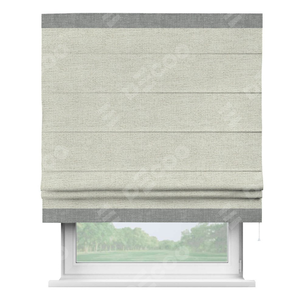Римская штора пошита из ткани рогожка димаут серо-бежевый, артикул: 91014, с отделкой кантом «Горизонт» предлагает уникальное дизайнерское решение, при котором кант располагается только вверху и снизу шторы. Такое решение делает акцент на горизонтальных линиях, визуально расширяя пространство и придавая окну более строгий и организованный вид. Отделка кантом в этих ключевых местах не только украшает штору, но и способствует её долговечности, защищая наиболее уязвимые к износу края.