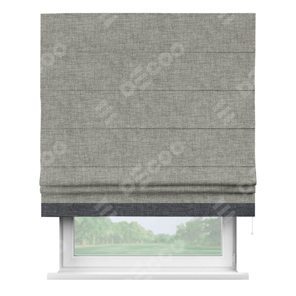 Римская штора пошита из ткани рогожка димаут серый дуб, артикул: 91028, с отделкой кантом «Джестер» выделяется своей уникальной особенностью — кантом, расположенным только снизу шторы. Этот дизайн добавляет оригинальности и игривости оконному оформлению, делая акцент на нижней части шторы и создавая интересный визуальный эффект. Отделка кантом на нижнем крае не только служит эстетической функции, но и способствует увеличению прочности и износостойкости ткани в этом месте.