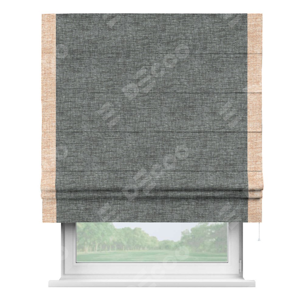 Римская штора пошита из ткани рогожка димаут тёмно-серый, артикул: 91029, с отделкой кантом «Стрим Дуо» выделяется наличием кантов по обоим бокам шторы, слева и справа. Этот дизайн придает шторе аккуратный и завершенный вид, акцентируя вертикальные линии и визуально вытягивая окно в высоту. Отделка кантом по бокам не только украшает штору, но и служит практической функцией, укрепляя края и продлевая срок службы изделия.
