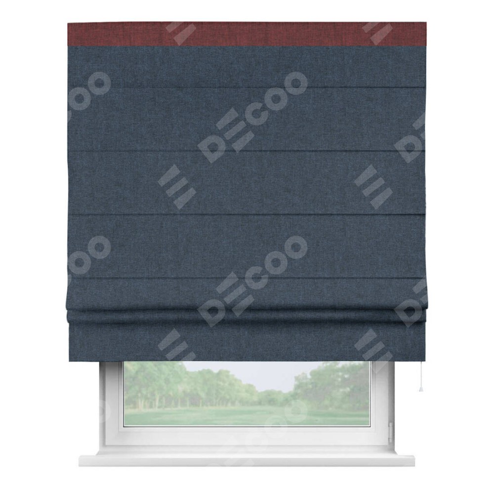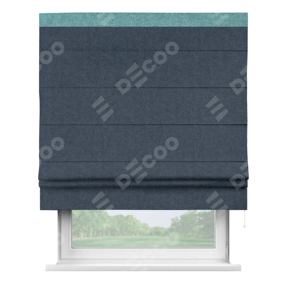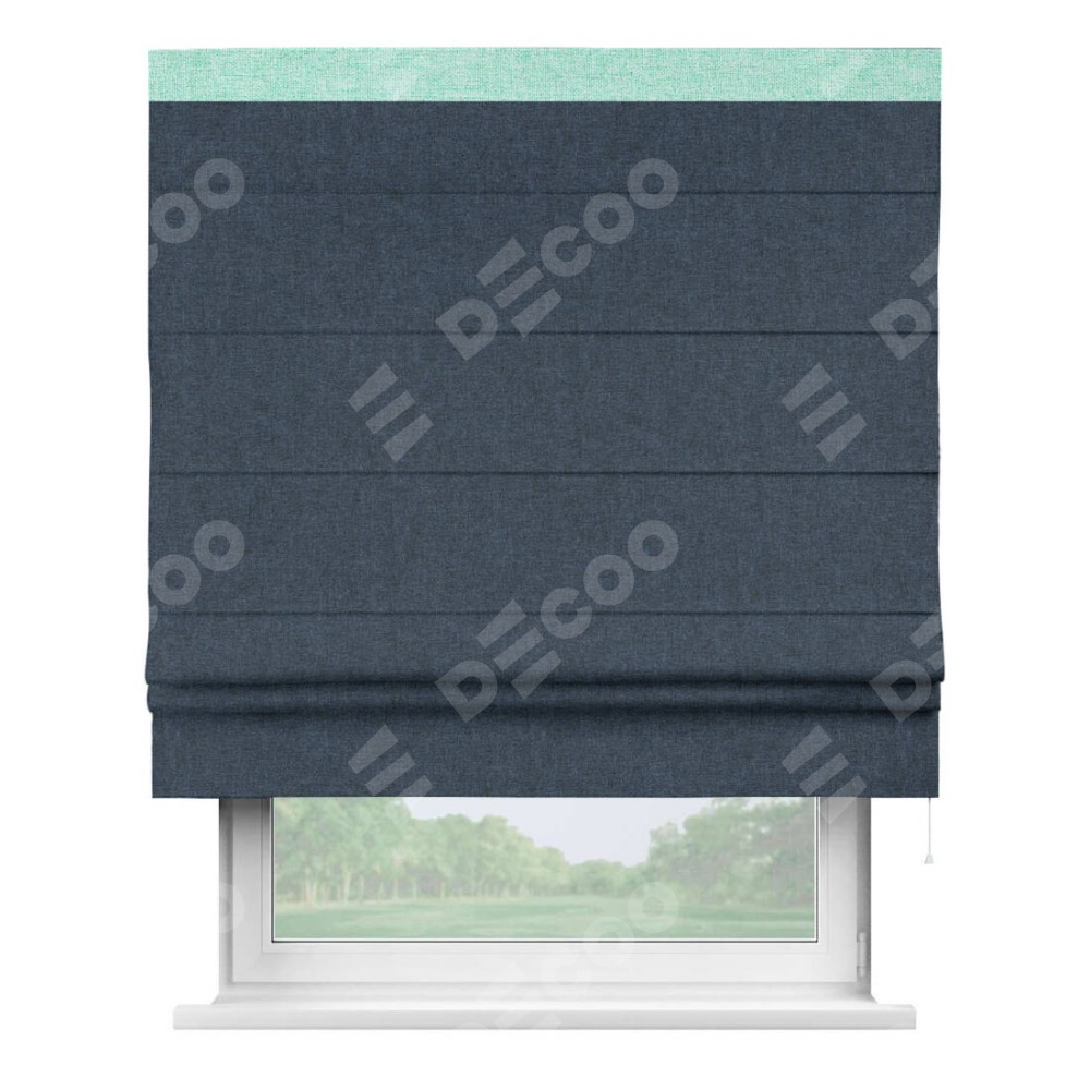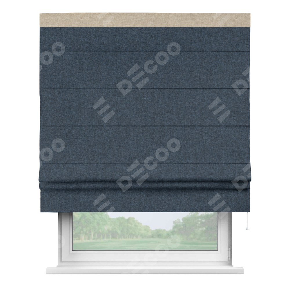 Римская штора пошита из ткани лён кашемир синий, артикул: 21623, с отделкой кантом «Кинг» отличается своей необычной особенностью: кант располагается исключительно сверху шторы. Такой дизайн делает акцент на верхней части окна, визуально поднимая потолок и придавая интерьеру более возвышенный и изысканный вид. Отделка кантом на верхней кромке не только украшает штору, но и может служить дополнительной защитой от износа в месте наибольшего контакта с механизмом управления шторой.