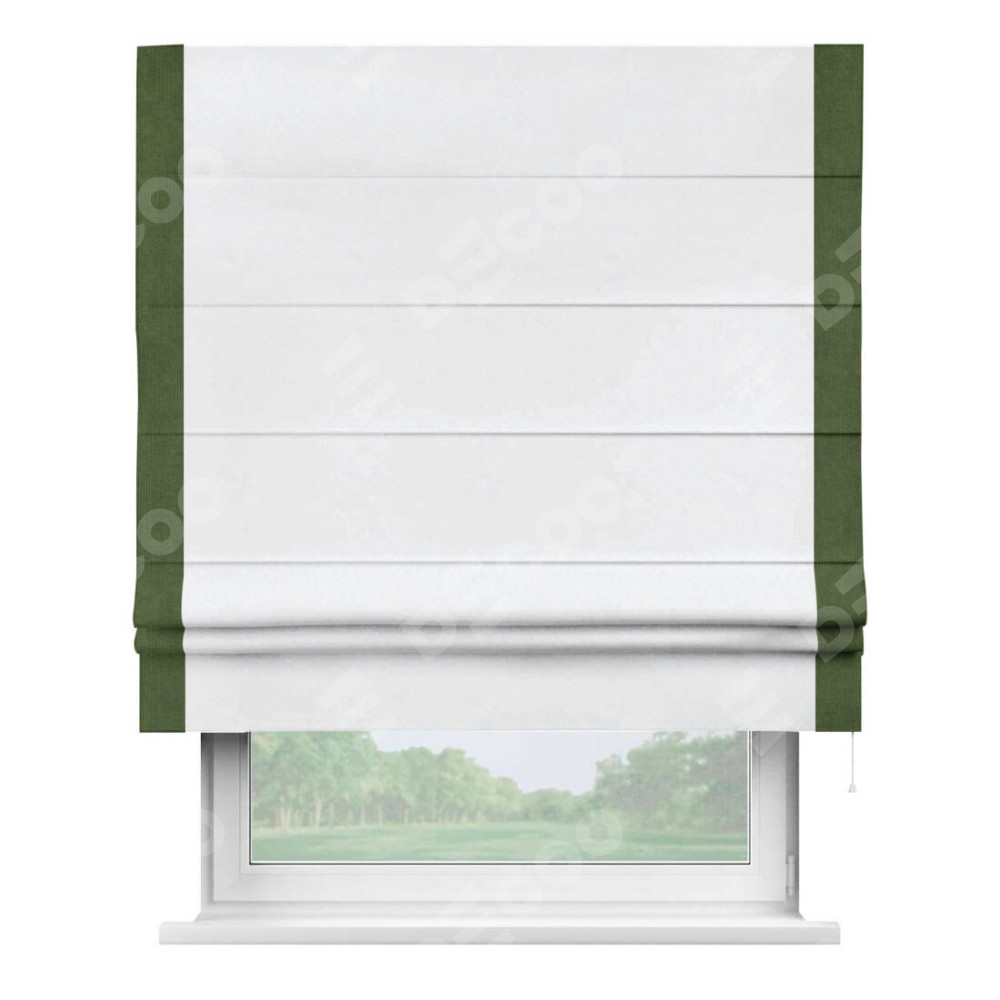 Римская штора пошита из ткани вельвет белоснежный, артикул: 92698, с отделкой кантом «Стрим Дуо» выделяется наличием кантов по обоим бокам шторы, слева и справа. Этот дизайн придает шторе аккуратный и завершенный вид, акцентируя вертикальные линии и визуально вытягивая окно в высоту. Отделка кантом по бокам не только украшает штору, но и служит практической функцией, укрепляя края и продлевая срок службы изделия.
