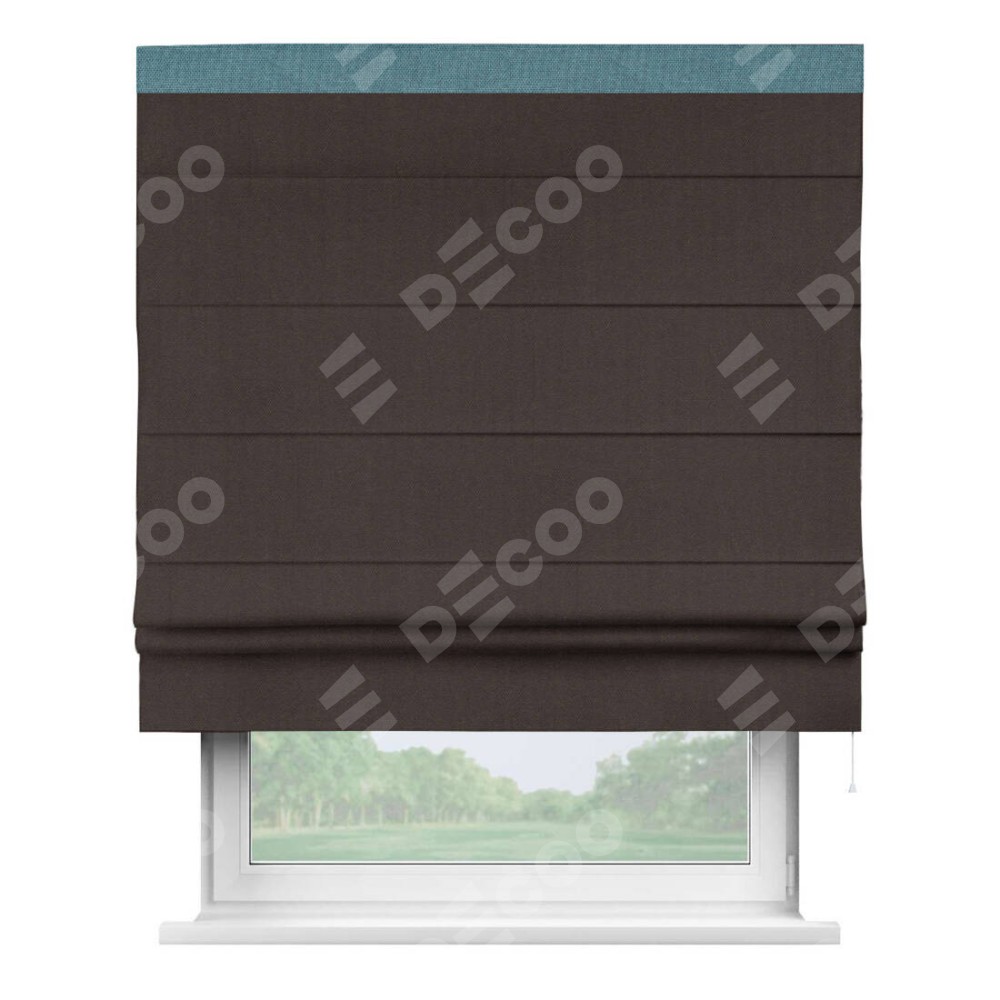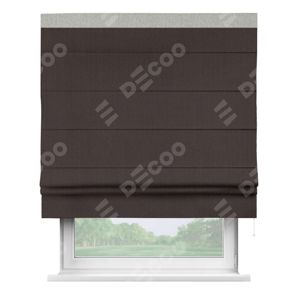 Римская штора пошита из ткани лён димаут венге, артикул: 91001, с отделкой кантом «Кинг» отличается своей необычной особенностью: кант располагается исключительно сверху шторы. Такой дизайн делает акцент на верхней части окна, визуально поднимая потолок и придавая интерьеру более возвышенный и изысканный вид. Отделка кантом на верхней кромке не только украшает штору, но и может служить дополнительной защитой от износа в месте наибольшего контакта с механизмом управления шторой.