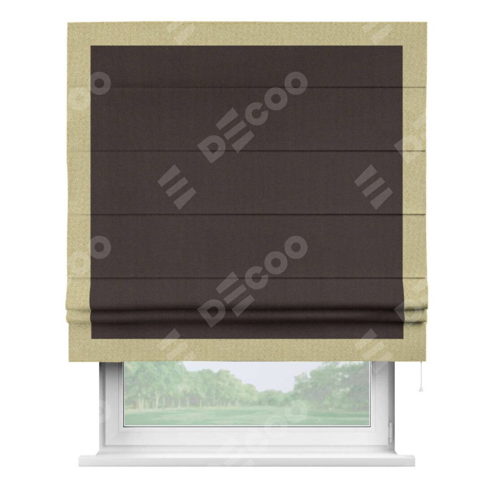 Римская штора пошита из ткани лён димаут венге, артикул: 91001, с отделкой кантом «Чесс» отличается своей уникальной деталью — наличием канта не только по бокам и снизу, но и сверху по всем краям шторы. Это придает шторе особенно аккуратный и завершенный вид, делая акцент на границах и форме шторы. Отделка кантом по всему периметру шторы усиливает её декоративные качества и подчеркивает строгую геометрию, что может быть особенно актуально для современных и минималистичных интерьеров.