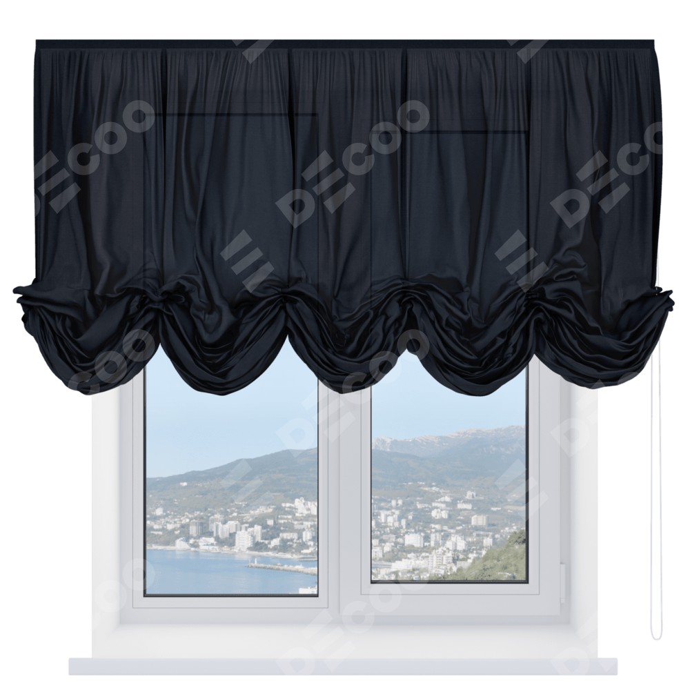 Австрийская штора производителя «Cortin», используется для проёма, пошита из ткани лён черный, артикул ткани 140815. Имеет универсальный механизм и подходит для монтажа: на потолок и на стену.
