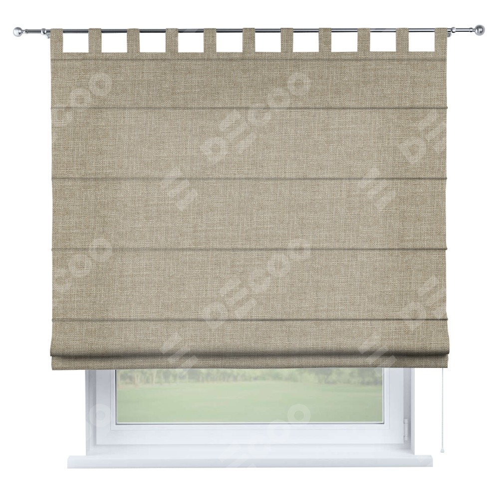 Римская штора производителя «Cortin», используется для проёма, пошита из ткани лён бежевый, артикул ткани 143839. Данная модель пошита на петлях, комплектуется на выбор круглым карнизом и подходит для монтажа на стену. Римская штора на петлях имеет простую систему регулировки высоты, отличительным преимуществом данной модели является простой способ монтажа. Достаточно повесить ее на трубу и штора готова!