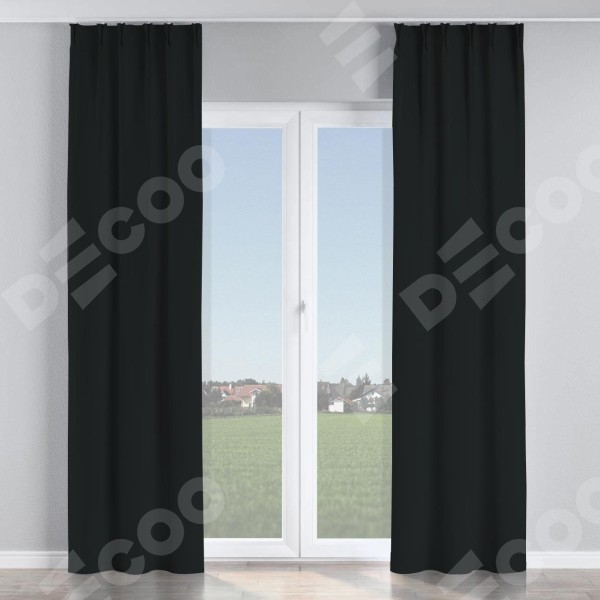 Комплект прямых штор, от производителя «Cortin», пошиты из ткани блэкаут однотонный черный, артикул ткани 37. С изнаночной стороны в верхней части штор пристрачивается шторная лента с декоративными складками «Кустик». Для создания элегантных складок прямые шторы шьются по стандарту с коэффициентом 1:2 (на 100 см. ширины проёма 200 см. ширины ткани).