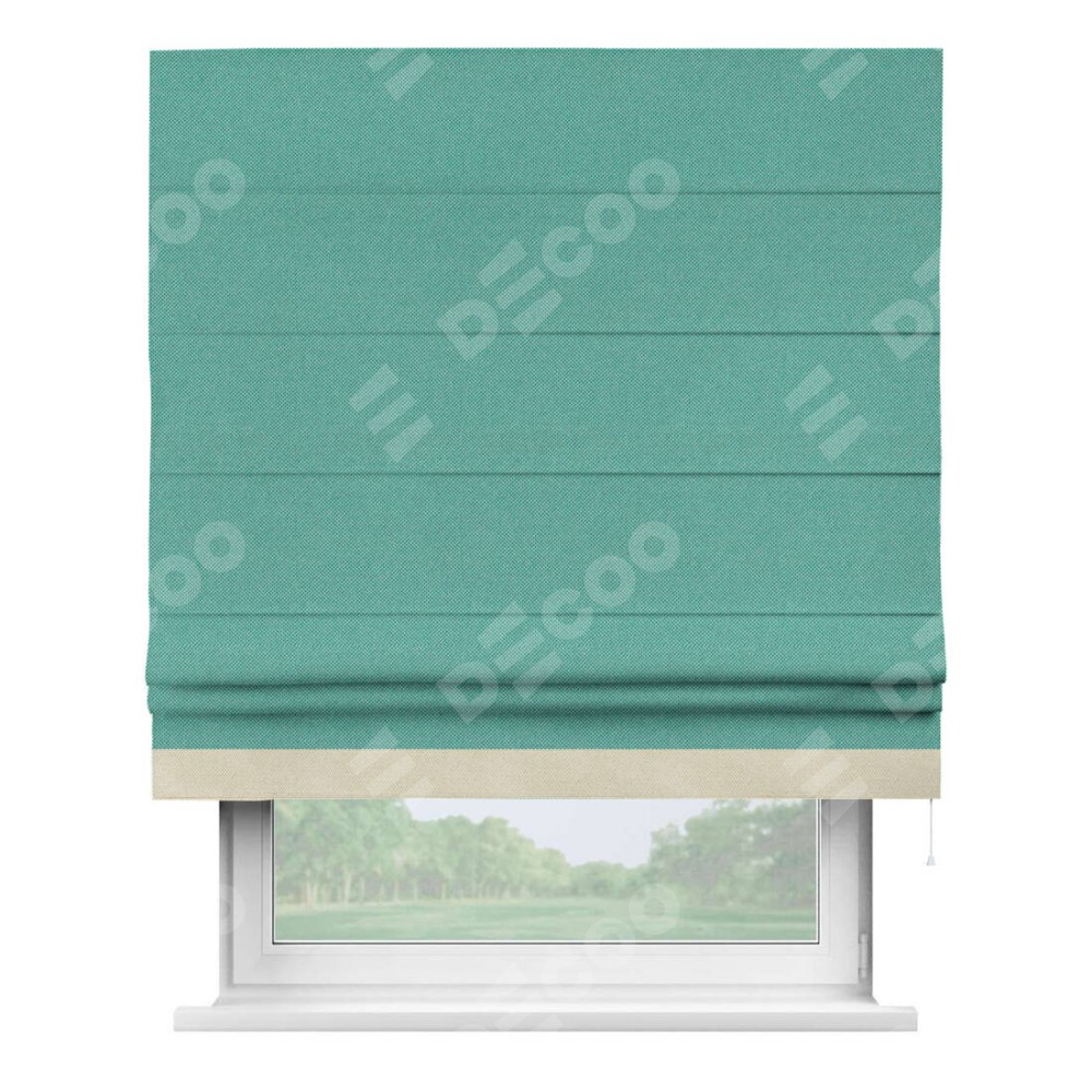 Римская штора производителя «Cortin», используется для проёма, пошита из ткани лён димаут бирюзовый, артикул 23. Отделка шторы кантом «Джестер», ткань для канта используется из льна димаут разной расцветки на выбор. Имеет универсальный механизм и подходит для монтажа: на потолок, на стену и в нишу.