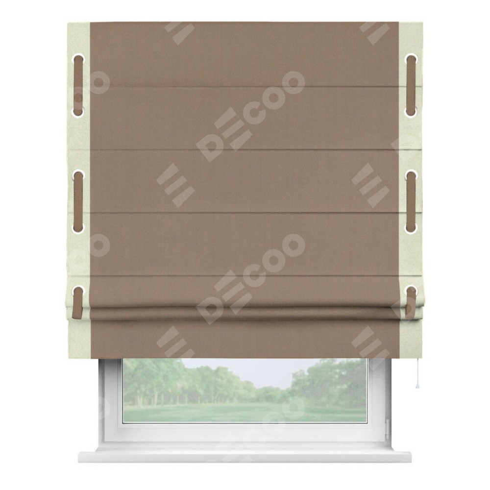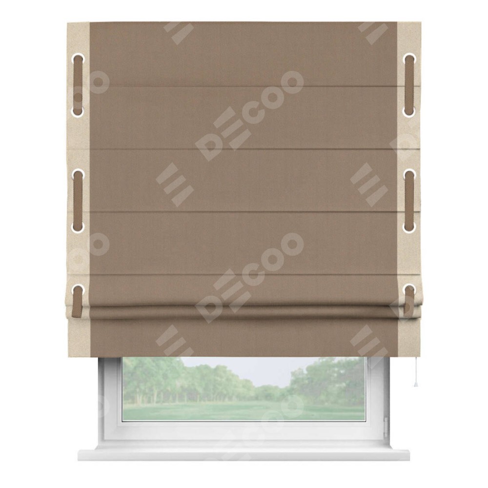 Римская штора «Cortin» для проёма, ткань блэкаут однотонный кофейно-бежевый с кантом Стрим Дуо (люверсы с пояском)