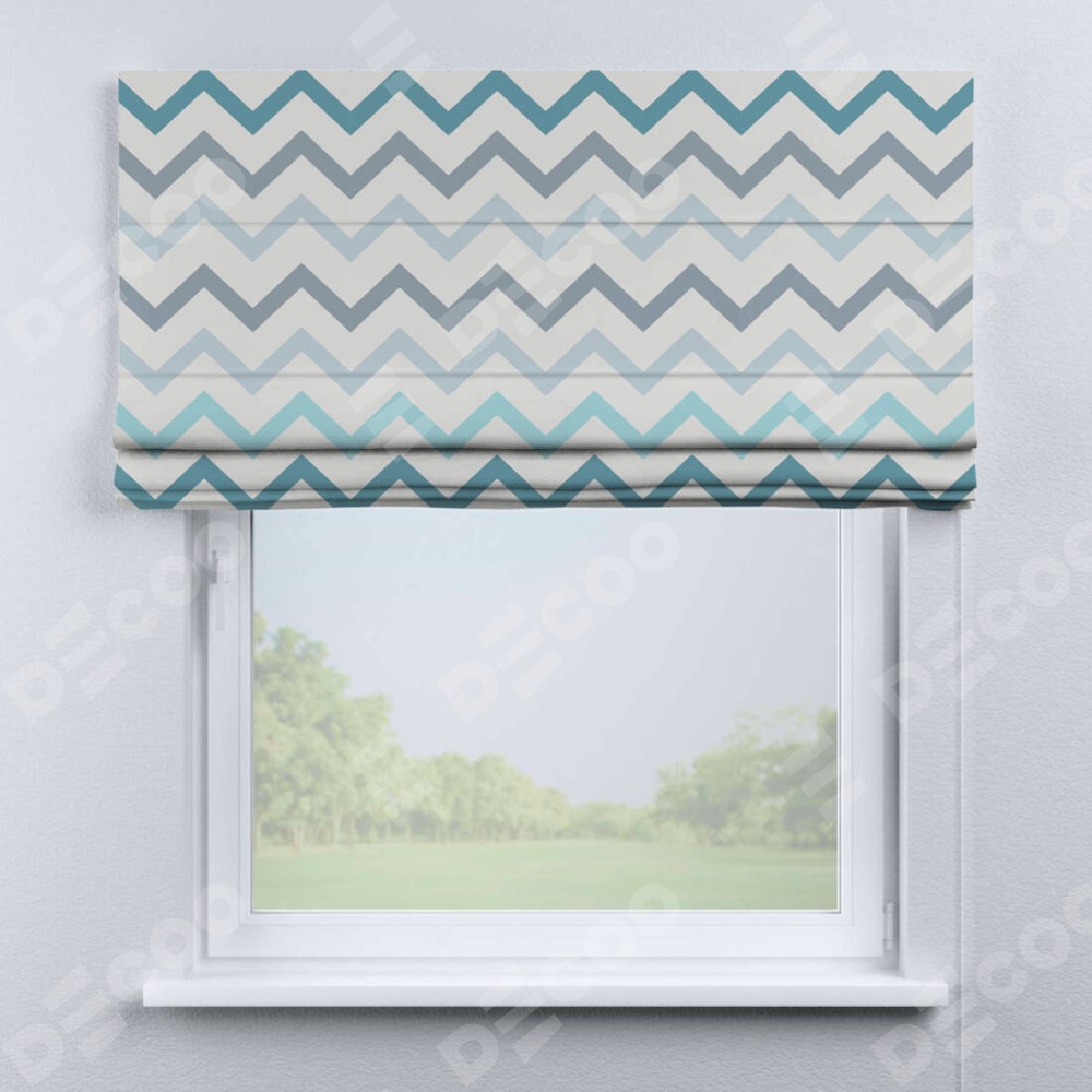 Классическая римская штора производителя «Cortin», пошита из ткани небесный шеврон, артикул:. Имеет универсальный механизм и подходит для монтажа: на потолок, на стену и в нишу.