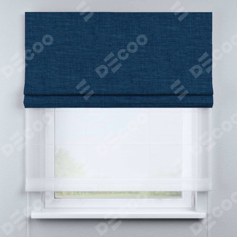 Двойная римская штора «День-ночь» от производителя Cortin предназначена для использования в проёмах. Эта штора уникальна тем, что состоит из двух полотен. На лицевой стороне находится лён синий (артикул: 104496), обеспечивающий эффективное затемнение. В комплект также входит вторая ткань — легкий белый тюль (артикул: V-01), который добавляет изящества и легкости оформлению окна. Кроме того, доступны и другие разновидности ткани тюль, выбор которых доступен по  ссылке .