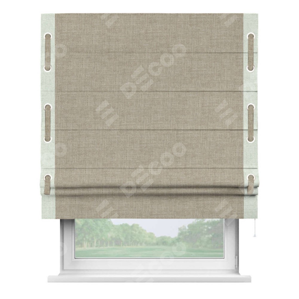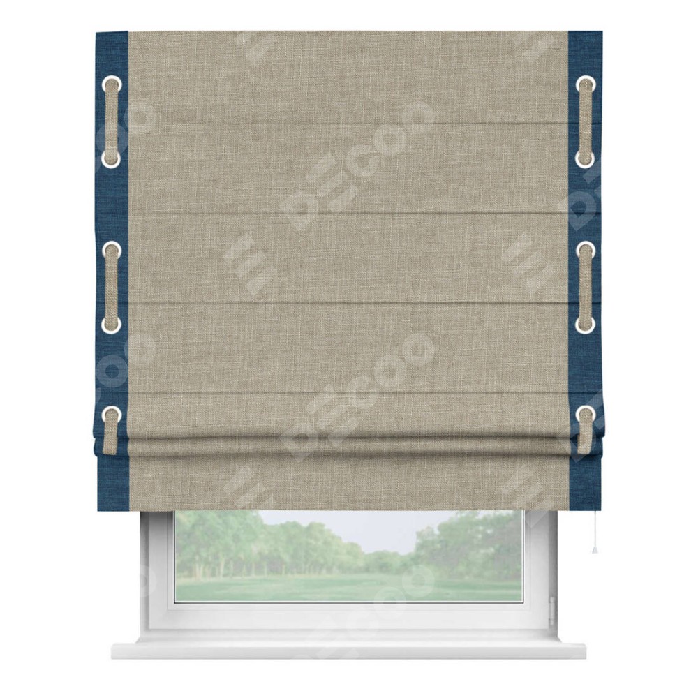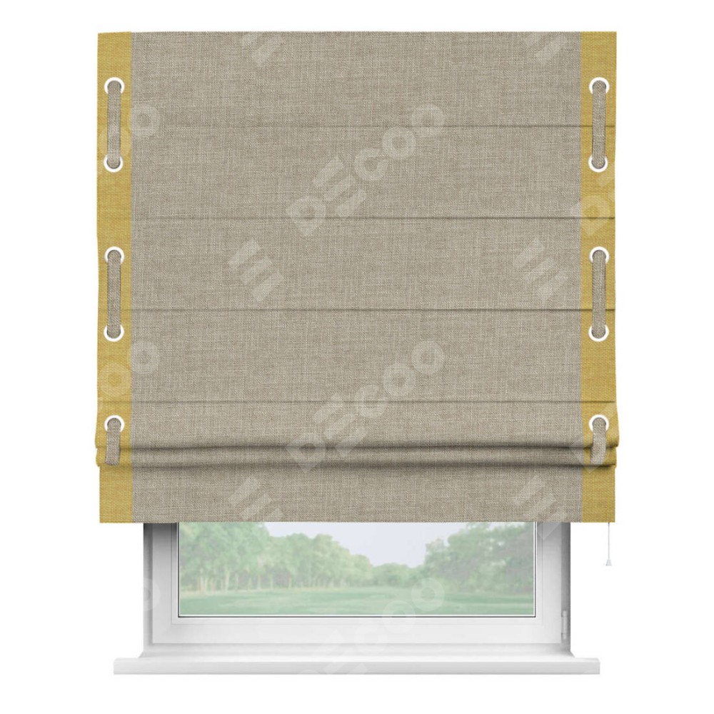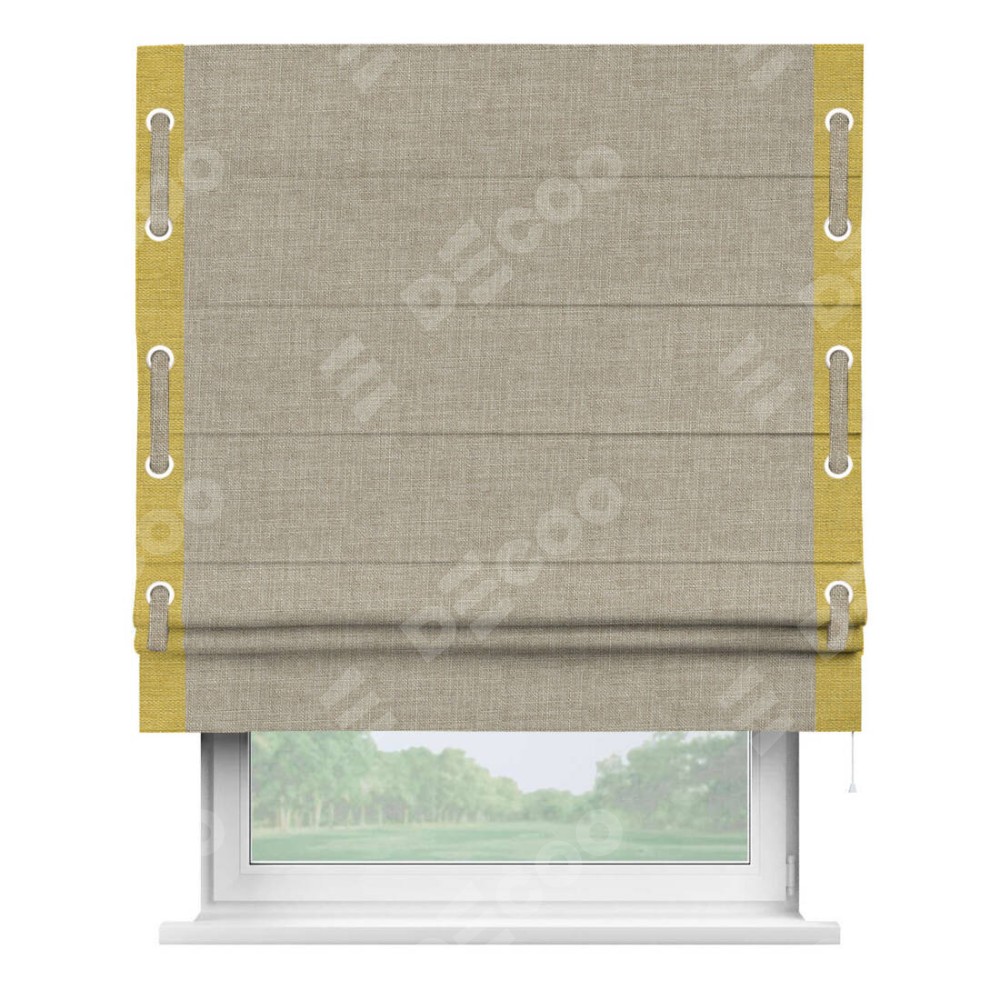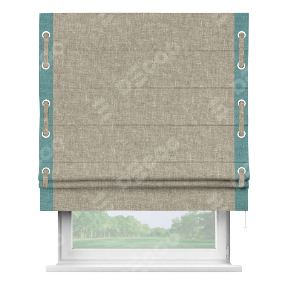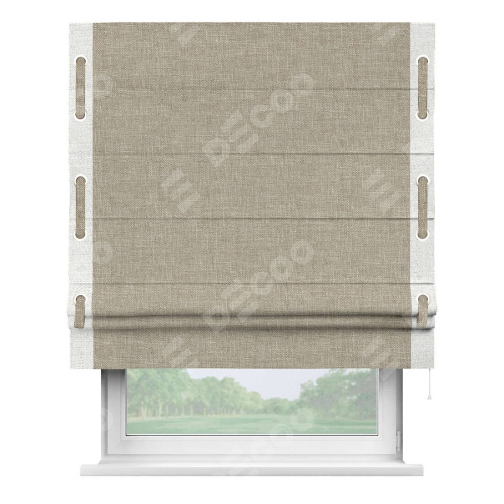 Римская штора «Кортин» для проёма, лён бежевый, с кантом Стрим Дуо (люверсы с пояском)