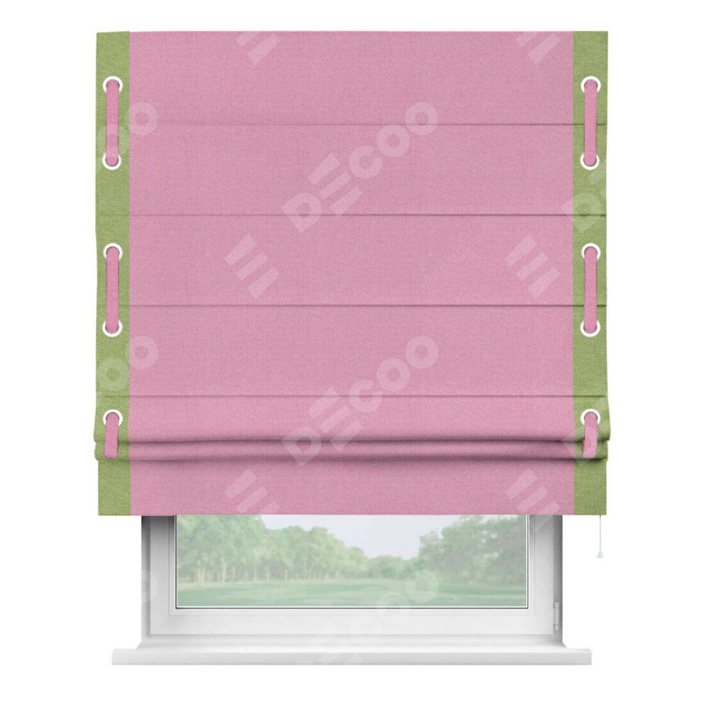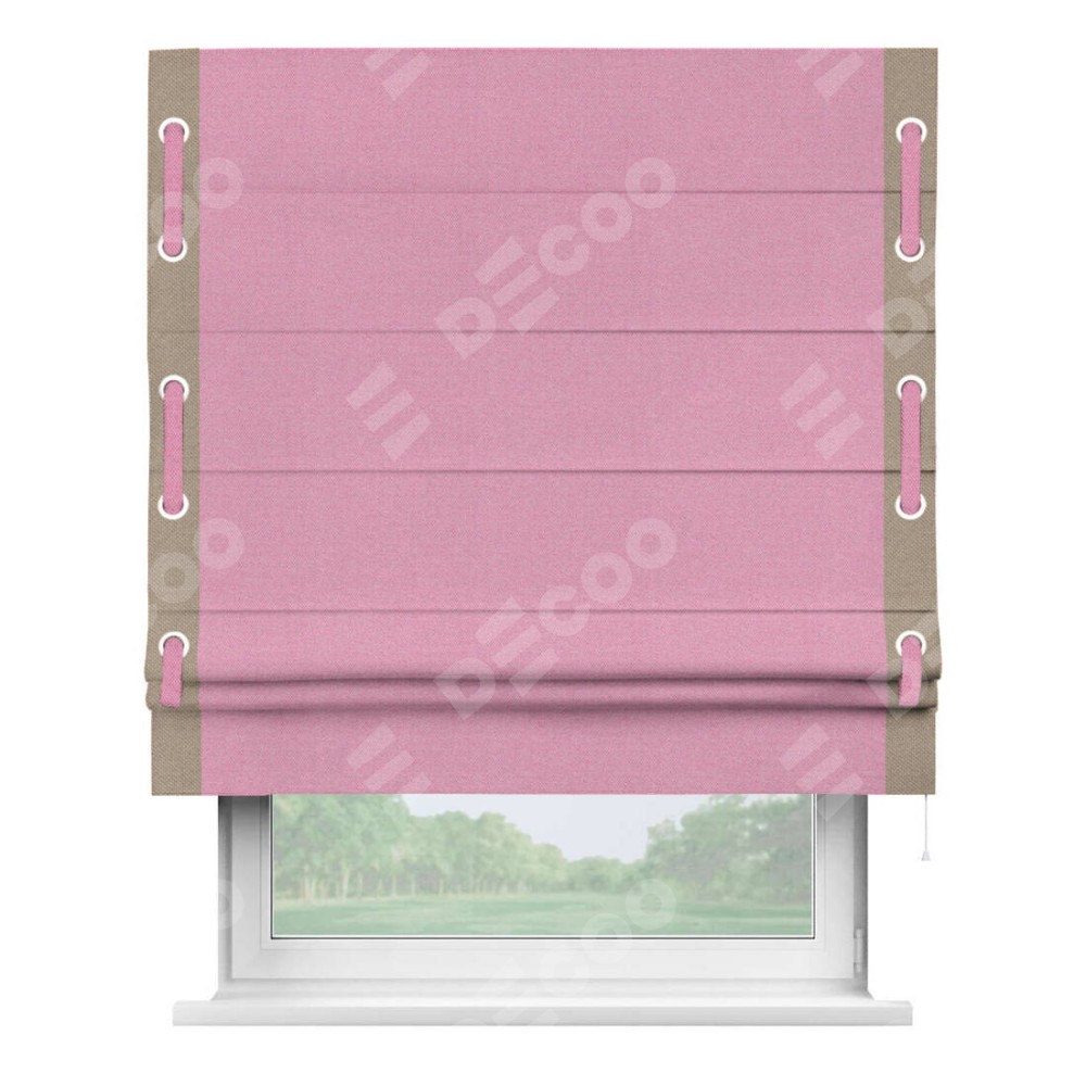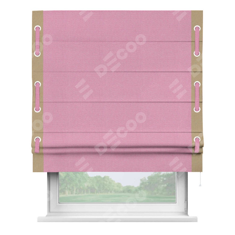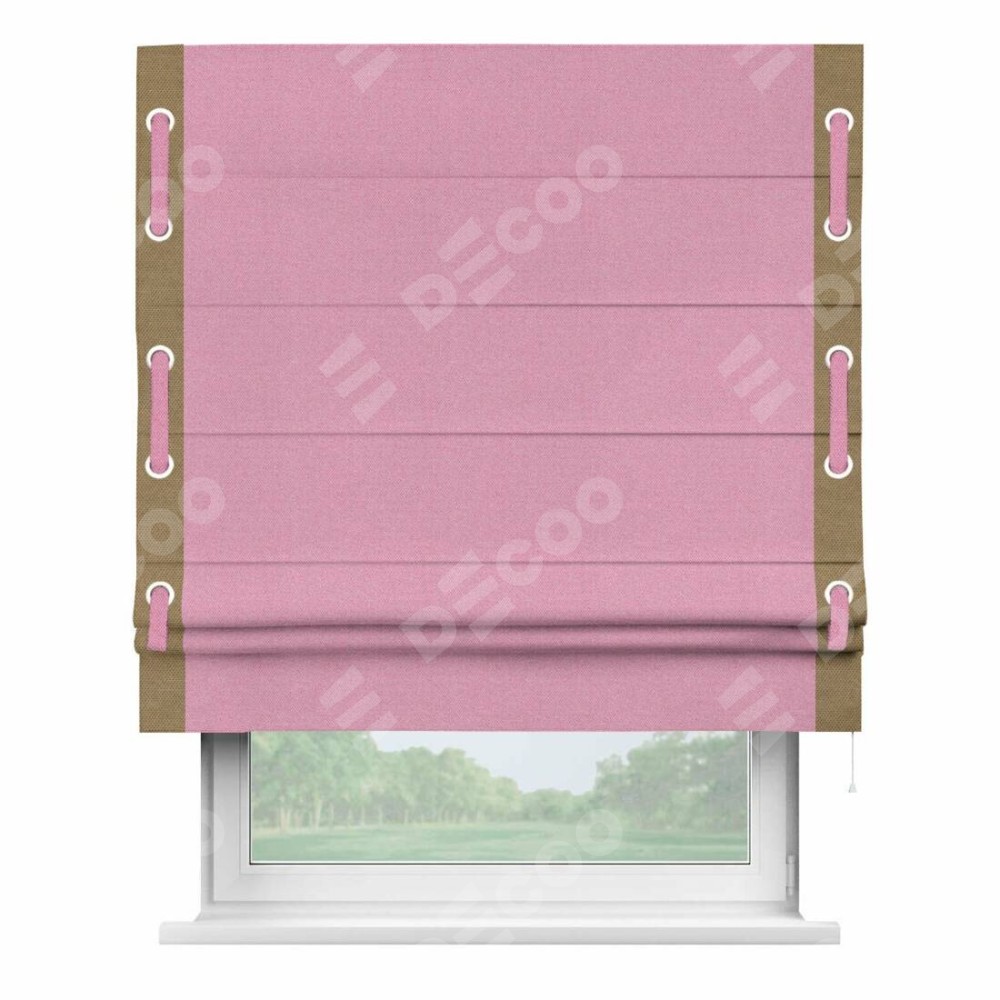 Римская штора производителя «Cortin», используется для проёма, пошита из ткани лён димаут розовый, артикул 16257. Отделка шторы кантом «Стрим Дуо» на кантах расположены люверсы с пояском, ткань для канта используется лён димаут разной расцветки на выбор. Ткань для пояска обычно используется из основной ткани шторы, а так же можно сделать из любой расцветки по желанию. Имеет универсальный механизм и подходит для монтажа: на потолок, на стену и в нишу.
