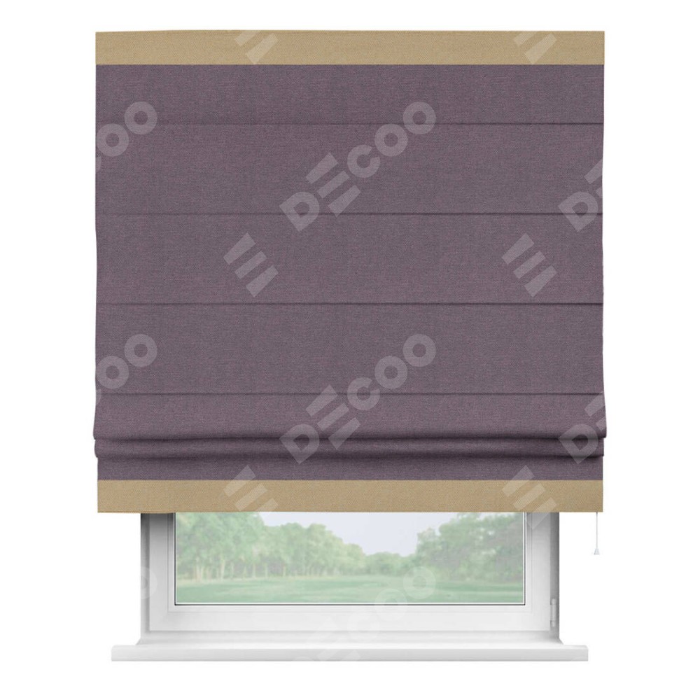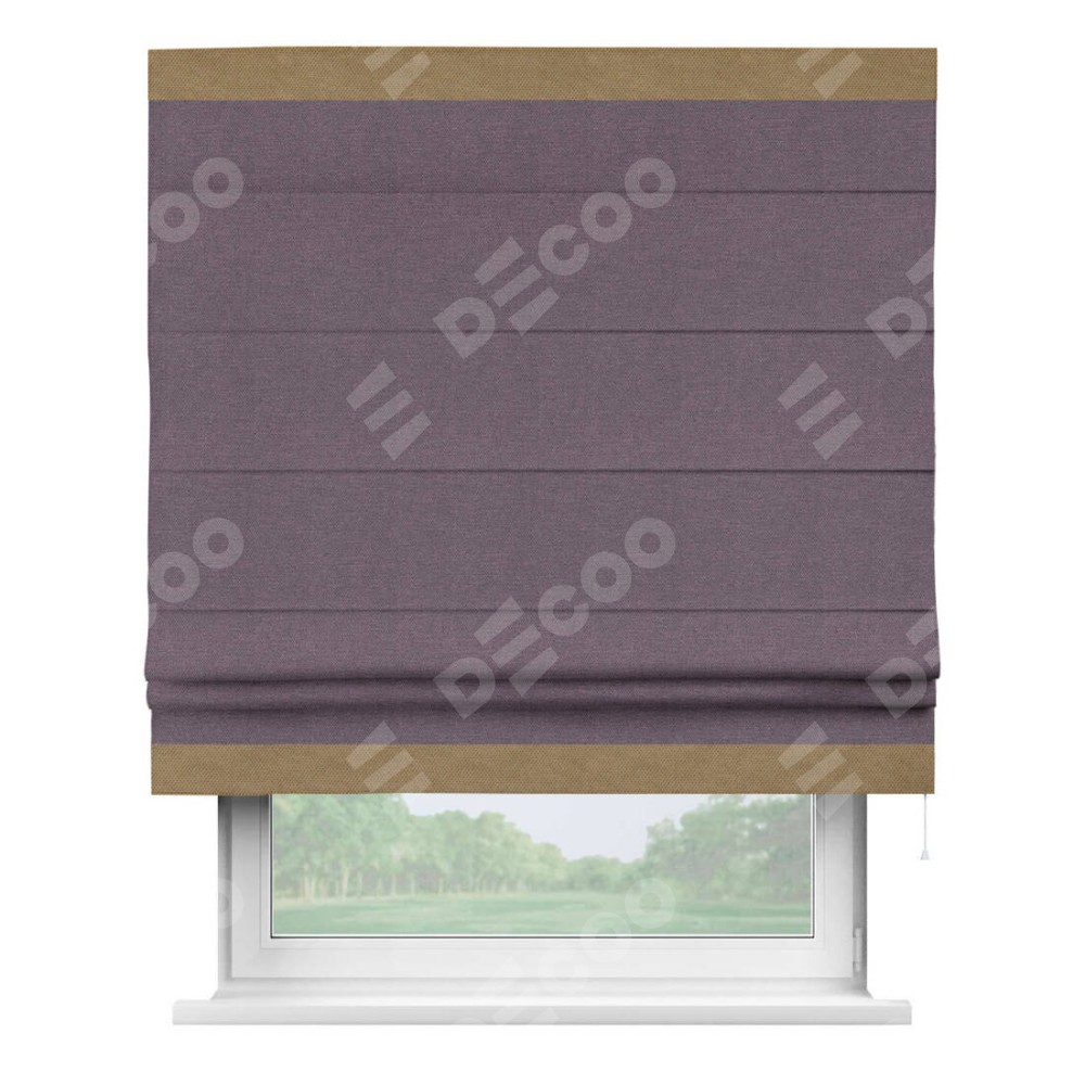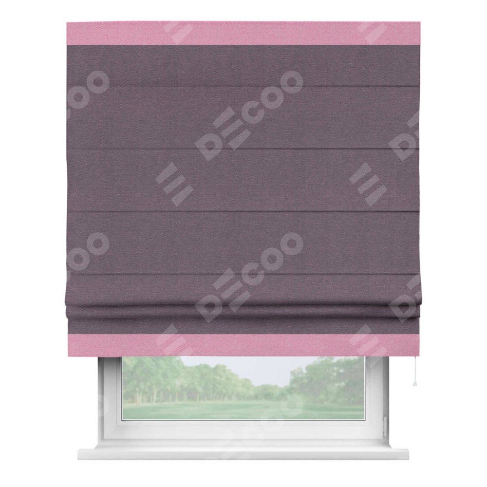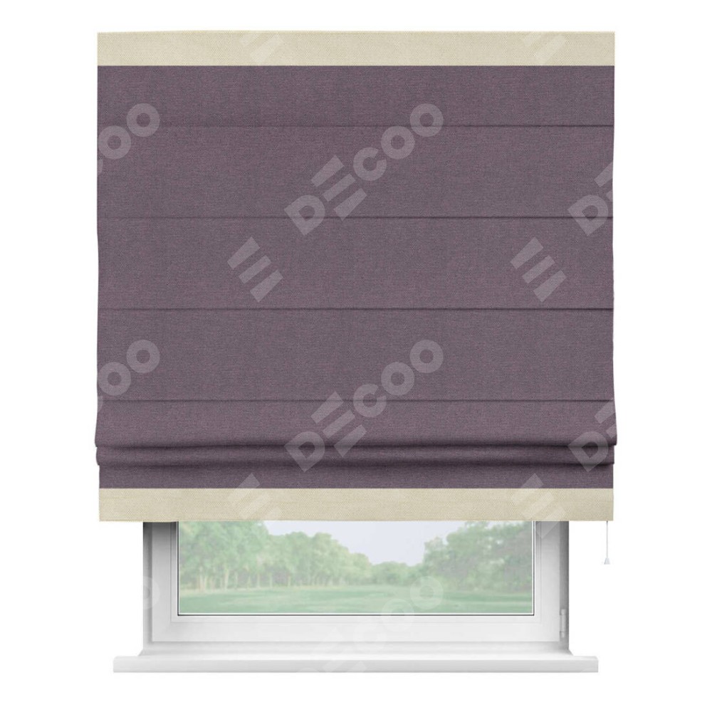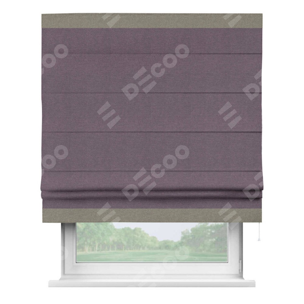 Римская штора производителя «Cortin», используется для проёма, пошита из ткани лён димаут светло-фиолетовый, артикул 83034. Отделка шторы кантом «Горизонт», ткань для канта используется из льна димаут разной расцветки на выбор. Имеет универсальный механизм и подходит для монтажа: на потолок, на стену и в нишу.