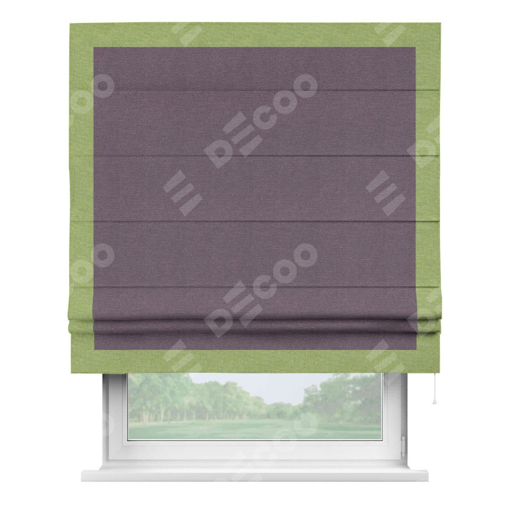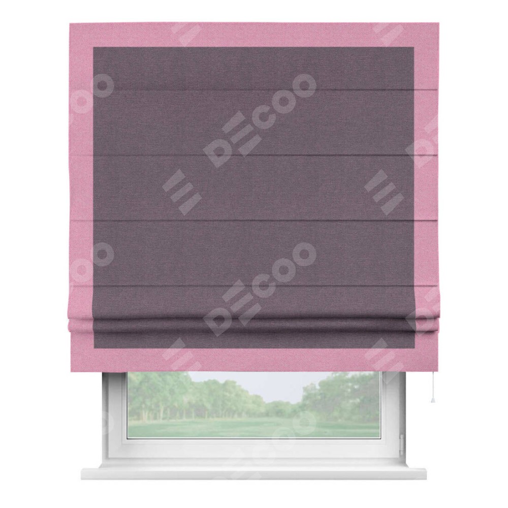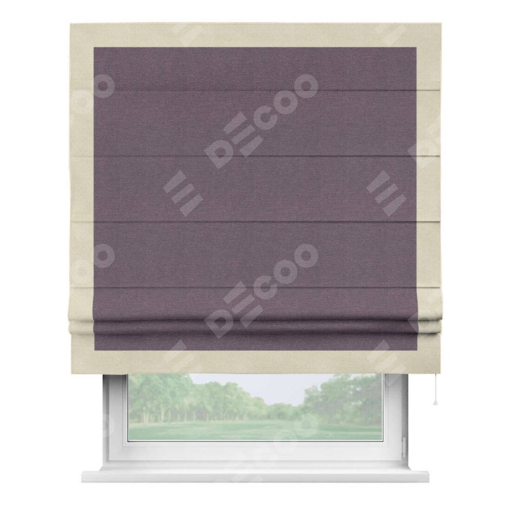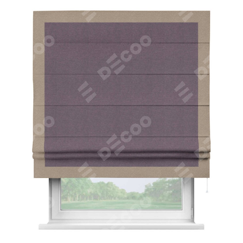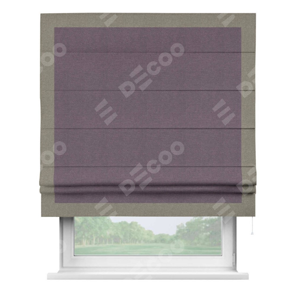 Римская штора производителя «Cortin», используется для проёма, пошита из ткани лён димаут светло-фиолетовый, артикул 83034. Отделка шторы кантом «Чесс», ткань для канта используется из льна димаут разной расцветки на выбор. Имеет универсальный механизм и подходит для монтажа: на потолок, на стену и в нишу.
