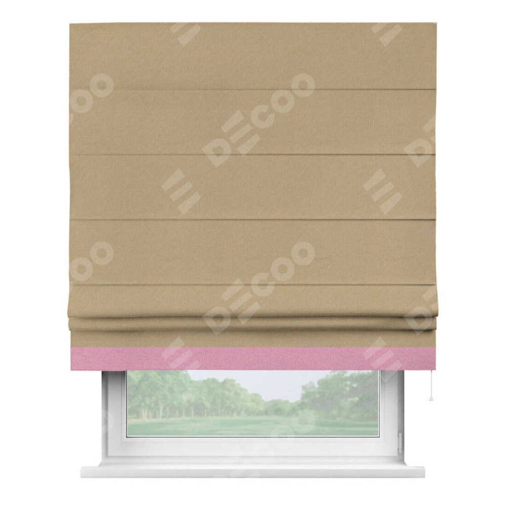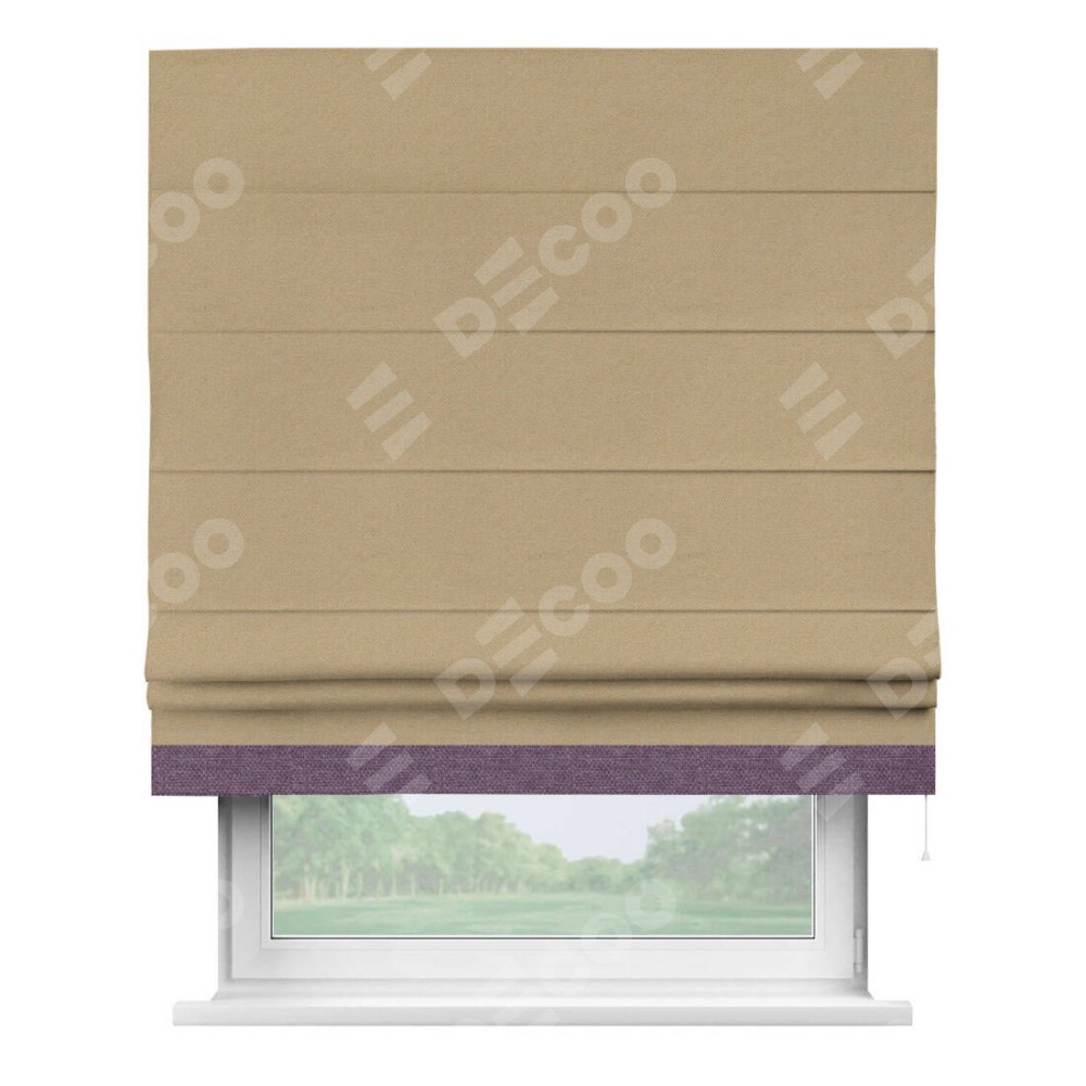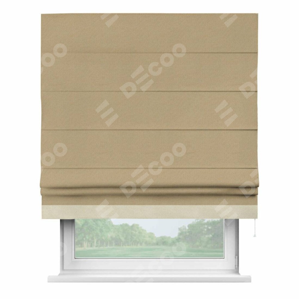 Римская штора производителя «Cortin», используется для проёма, пошита из ткани лён димаут тёмно-бежевый, артикул 83037. Отделка шторы кантом «Джестер», ткань для канта используется из льна димаут разной расцветки на выбор. Имеет универсальный механизм и подходит для монтажа: на потолок, на стену и в нишу.