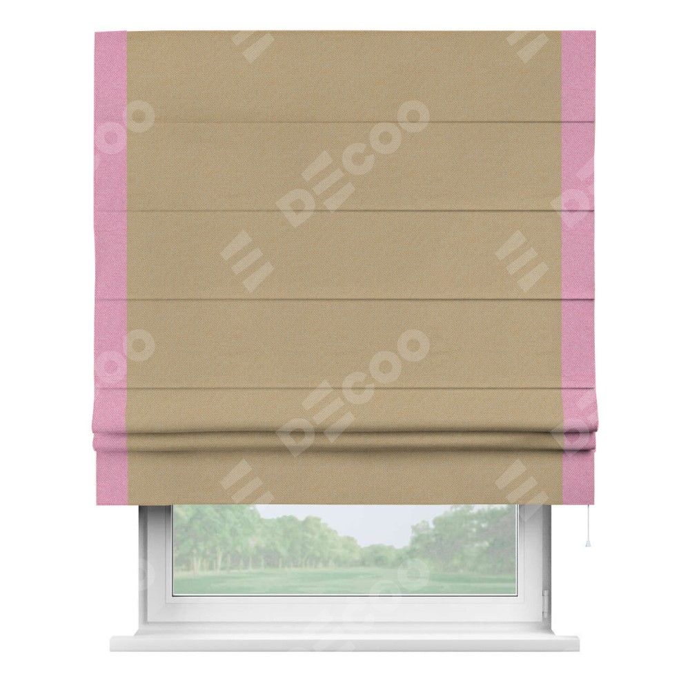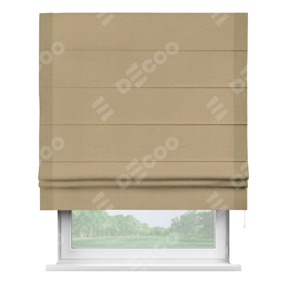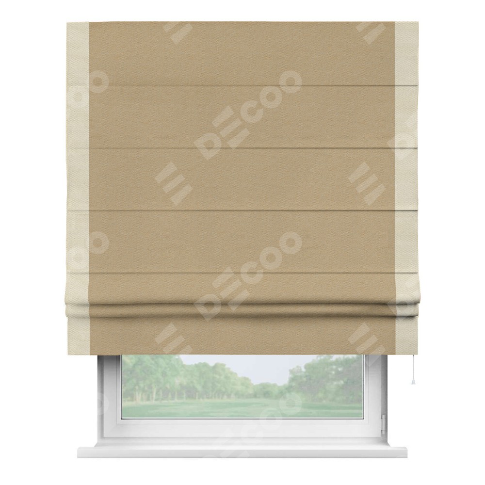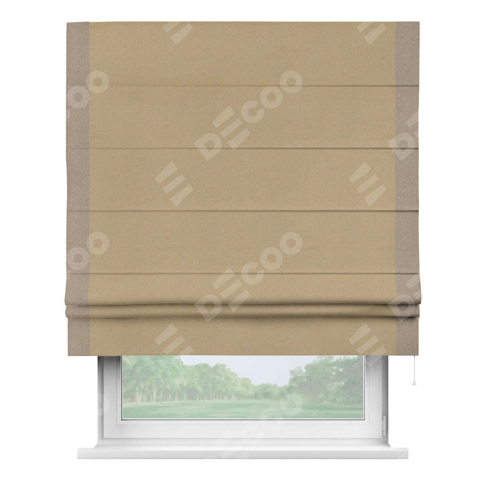 Римская штора производителя «Cortin», используется для проёма, пошита из ткани лён димаут тёмно-бежевый, артикул 83037. Отделка шторы кантом «Стрим Дуо», ткань для канта используется из льна димаут разной расцветки на выбор. Имеет универсальный механизм и подходит для монтажа: на потолок, на стену и в нишу.