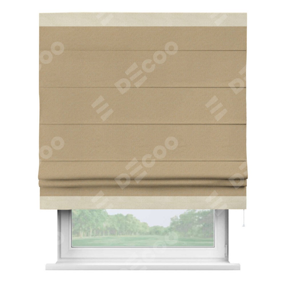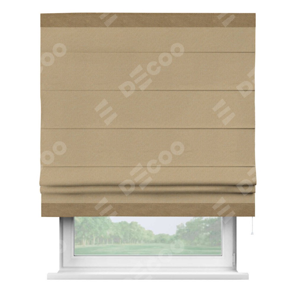 Римская штора производителя «Cortin», используется для проёма, пошита из ткани лён димаут тёмно-бежевый, артикул 83037. Отделка шторы кантом «Горизонт», ткань для канта используется из льна димаут разной расцветки на выбор. Имеет универсальный механизм и подходит для монтажа: на потолок, на стену и в нишу.