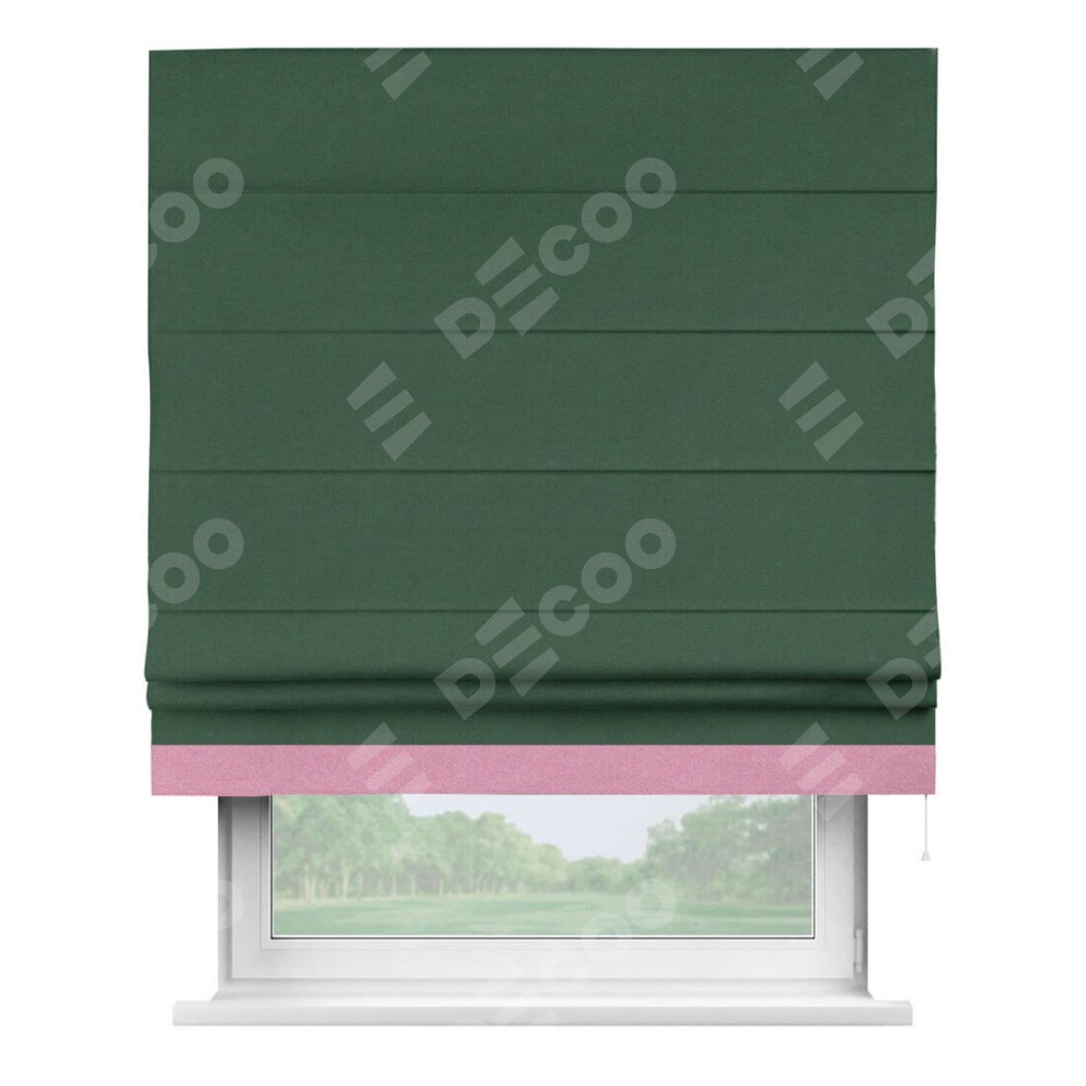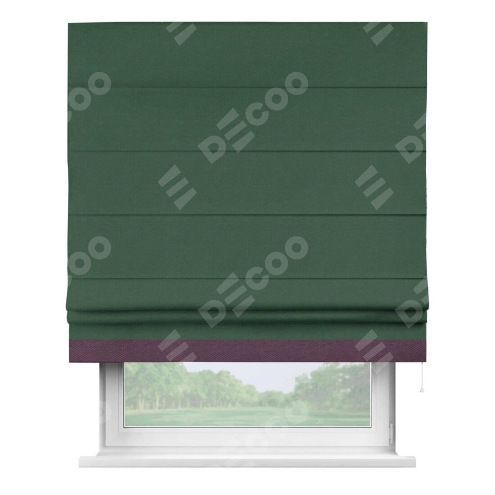 Римская штора производителя «Cortin», используется для проёма, пошита из ткани лён димаут тёмно-зелёный, артикул 16246. Отделка шторы кантом «Джестер», ткань для канта используется из льна димаут разной расцветки на выбор. Имеет универсальный механизм и подходит для монтажа: на потолок, на стену и в нишу.