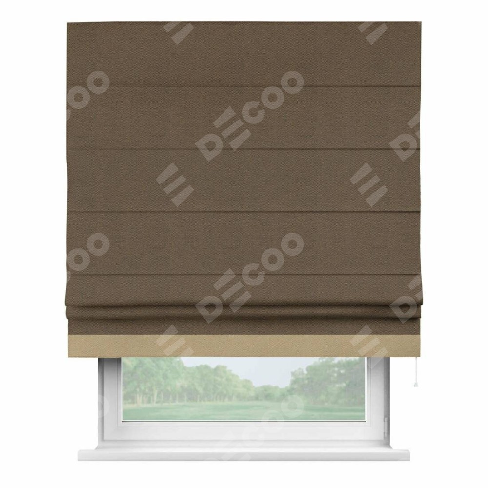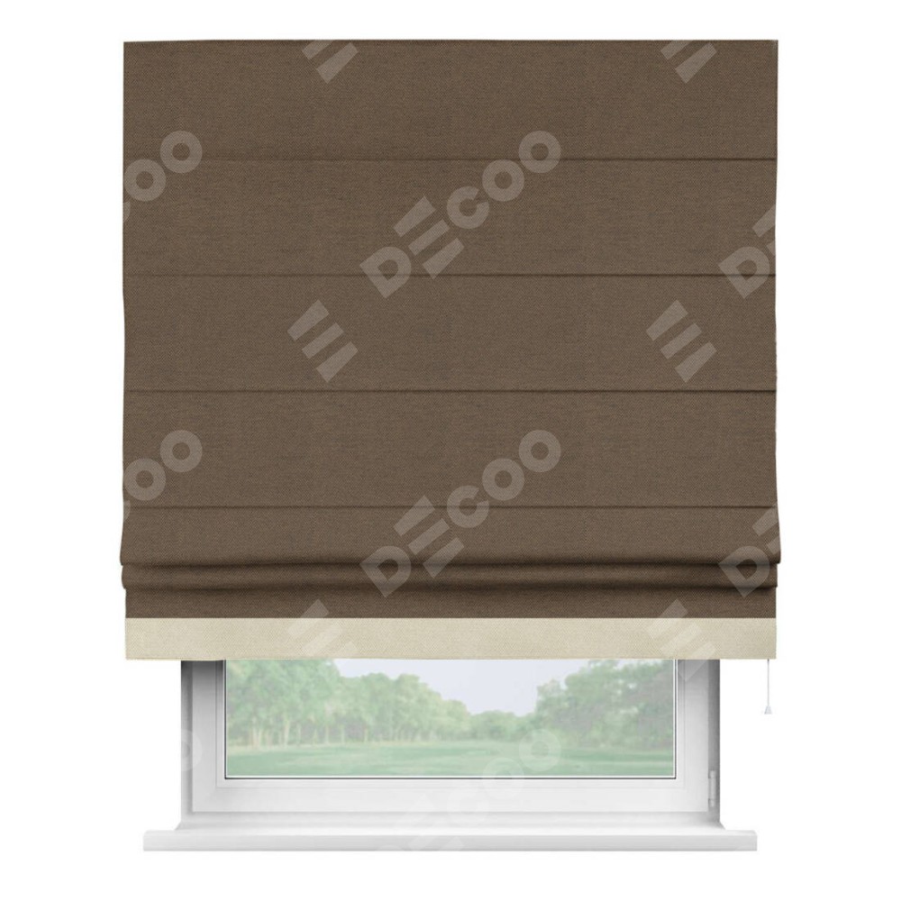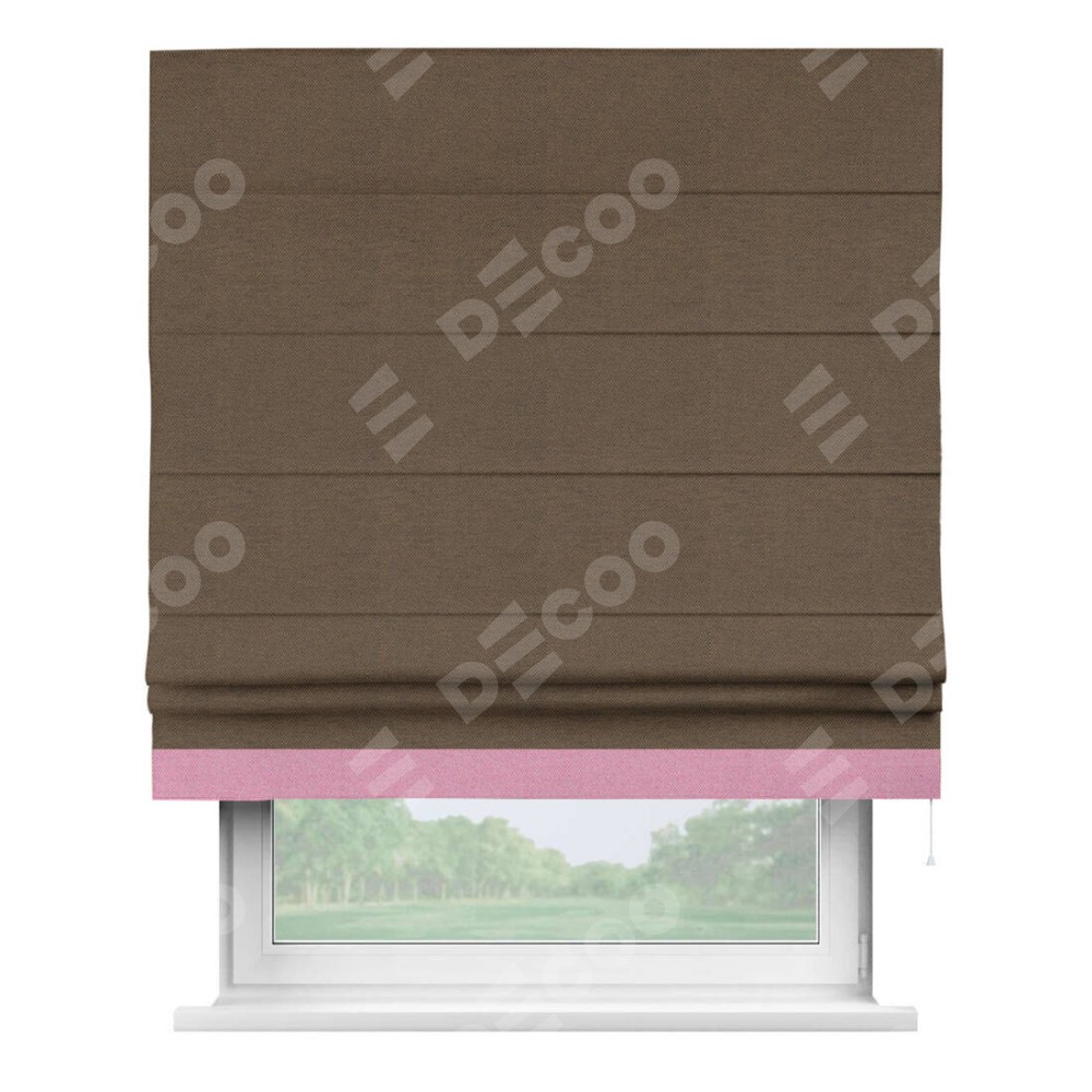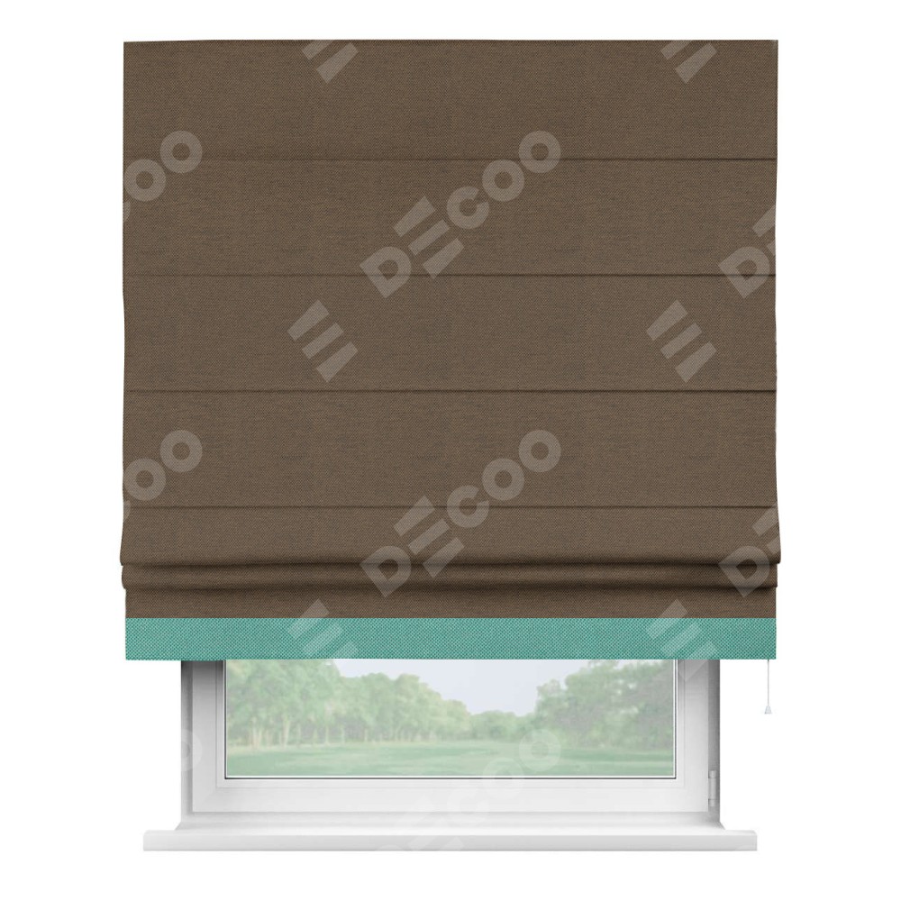 Римская штора производителя «Cortin», используется для проёма, пошита из ткани лён димаут тёмно-коричневый, артикул 83030. Отделка шторы кантом «Джестер», ткань для канта используется из льна димаут разной расцветки на выбор. Имеет универсальный механизм и подходит для монтажа: на потолок, на стену и в нишу.