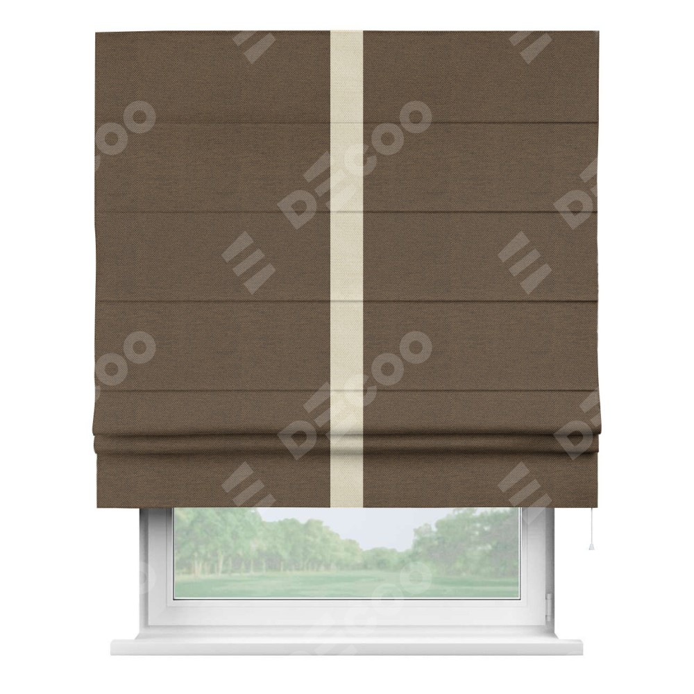 Римская штора производителя «Cortin», используется для проёма, пошита из ткани лён димаут тёмно-коричневый, артикул 83 030. Отделка шторы кантом «Хайвэй», ткань для канта используется из льна димаут разной расцветки на выбор. Имеет универсальный механизм и подходит для монтажа: на потолок, на стену и в нишу.