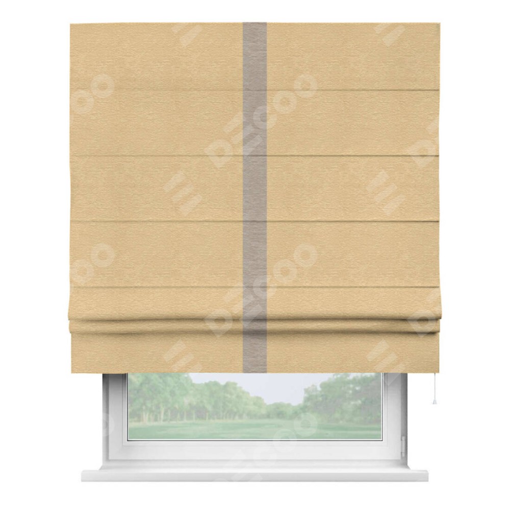 Римская штора производителя «Cortin», используется для проёма, пошита из ткани софт однотонный бежевый, артикул 4202 05. Отделка шторы кантом «Хайвэй», ткань для канта используется из софта разной расцветки на выбор. Имеет универсальный механизм и подходит для монтажа: на потолок, на стену и в нишу.